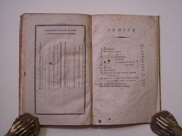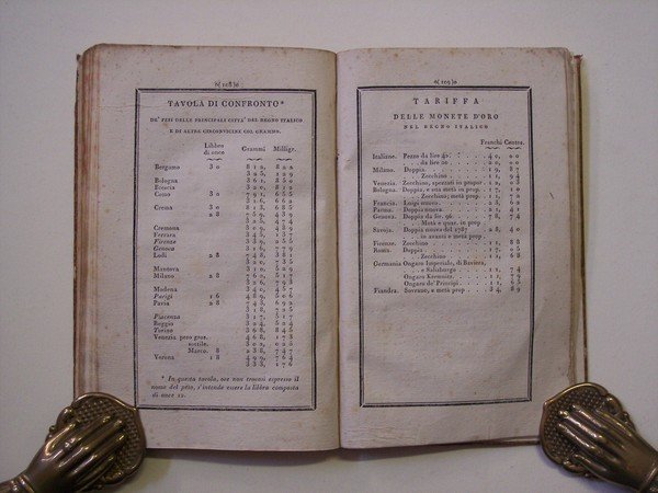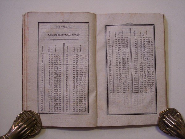 Cm. 20,5 x 12,5; pp. 118 + indice con tabelle di confronto di pesi e misure; legatura in cartonato marmorizzato d'epoca; tagli spruzzati.<BR>Condizioni più che discrete: leggere abrasioni alla copertina; alcune fioriture (più intense verso il fondo del libro); tracce di polvere agli angoli inferiori delle ultime pagine; scritta di proprietà d'epoca alla sguardia; una piccola scritta d'epoca a penna alla sguardia posteriore.