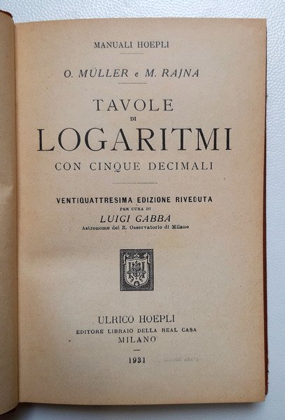 Tavole di Logaritmi con cinque decimali - Ventiquattresima edizione riveduta per cura di Luigi Gabba, Astronomo del R. Osservatorio di Milano.