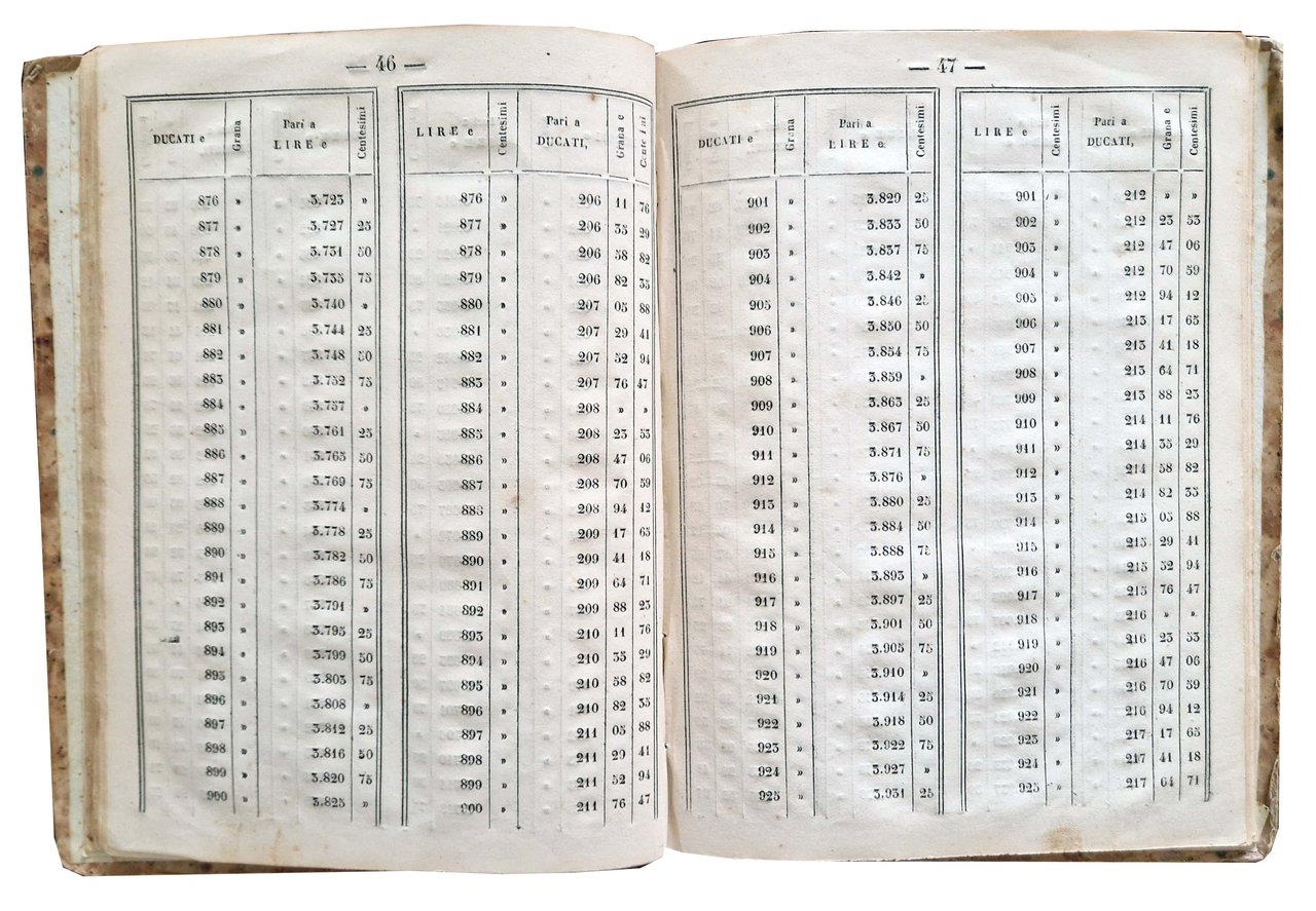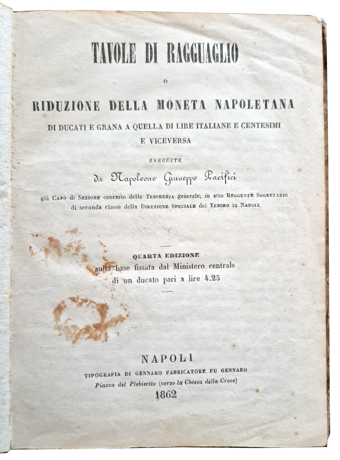 Tavole di ragguaglio o riduzione della moneta napoletana di ducati e grana a quella di lire italiane e centesimi e viceversa eseguite da Napoleone Giuseppe Pacifici […]. Quarta edizione sulla base fissata dal Ministero centrale di un ducato pari a lire 4.25.