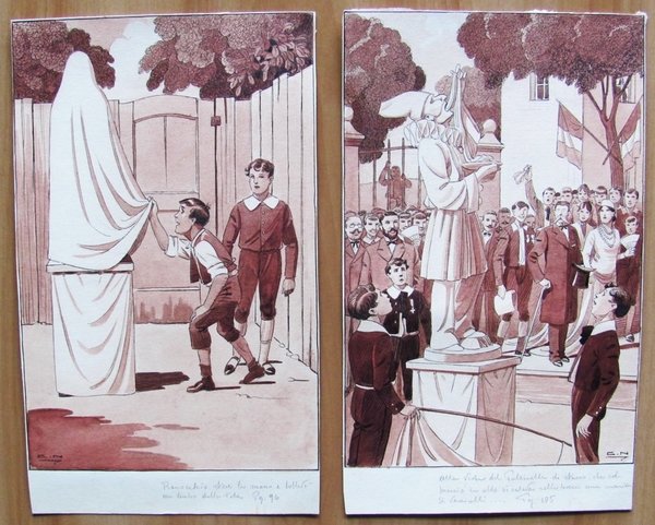 2 tavole originali per le illustrazioni del libro, per le pagine 96 e 105, in china diluita su cartoncino, firmate C.N. 18x29,9 ognuna. 1943, rare e in Ottimo stato. ,