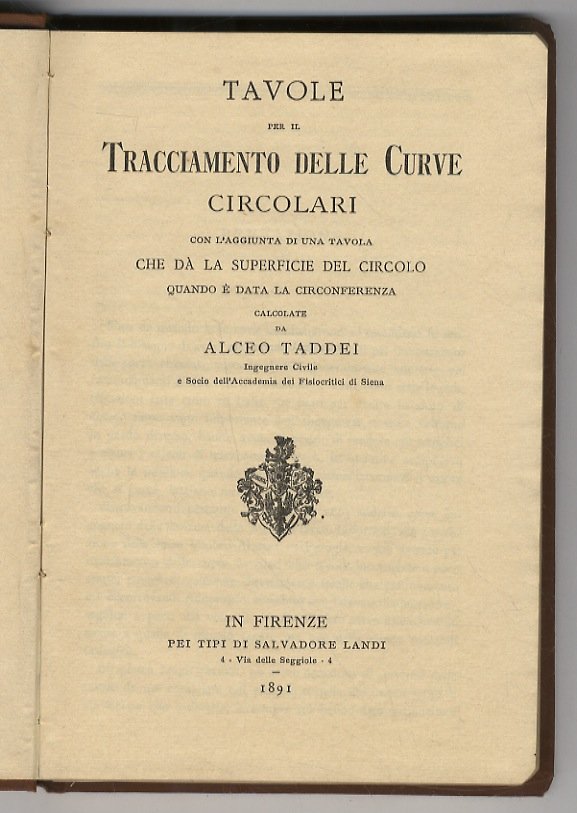 In Firenze, pei tipi di Salvadore Landi, 1891, in-8, tela editoriale con titolo in oro e decorazioni in nero sul piatto anteriore, pp. XX, 170, [2]. Ottime condizioni. Volume che dimostra come Salvatore Landi sapesse stampare con cura ed eleganza anche libri tecnici, recanti principalmente numeri.