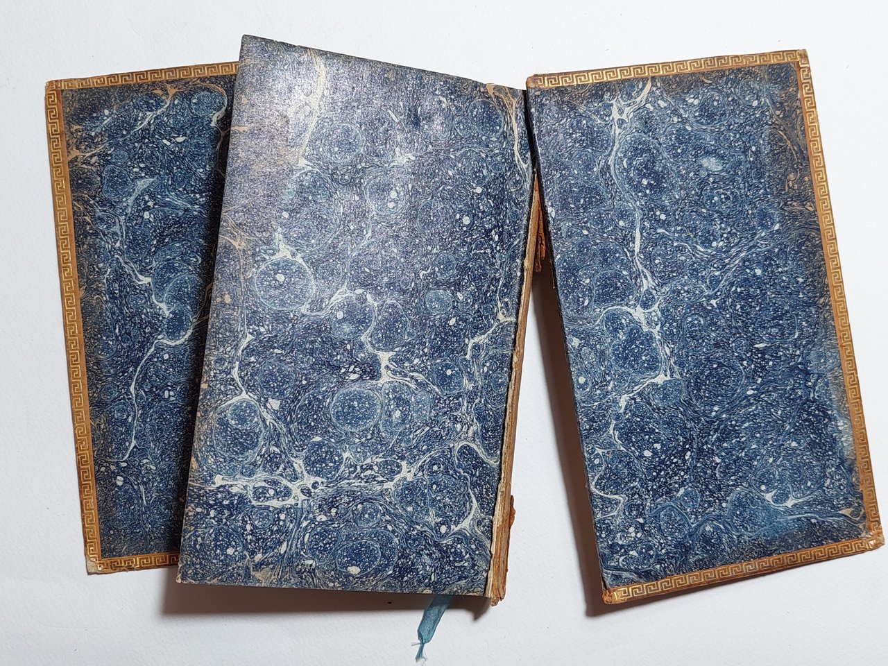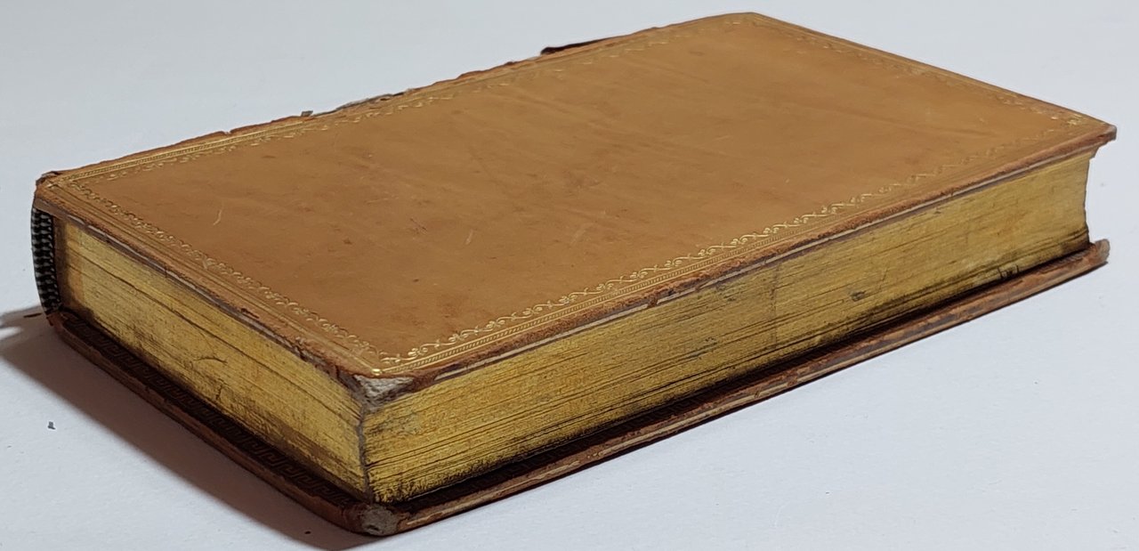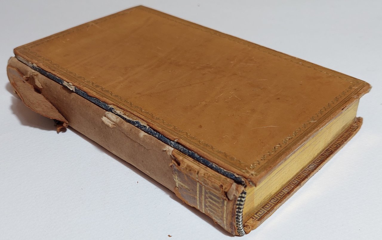 Legatura in pelle rigida, con bordura decorata in oro ai piatti, tagli in oro. Il volume è diviso in due toni, al secondo tomo l'appendice. La legatura è in pessime condizioni, piatti staccati, la pelle del dorso è quasi completamente mancante, una breve nota a penna e numerose note manoscritte a matita alle prime due pagine bianche, scritte e segni a matita su circa 20 pagine alcune sporadiche fioriture su circa 20- 30 pagine.