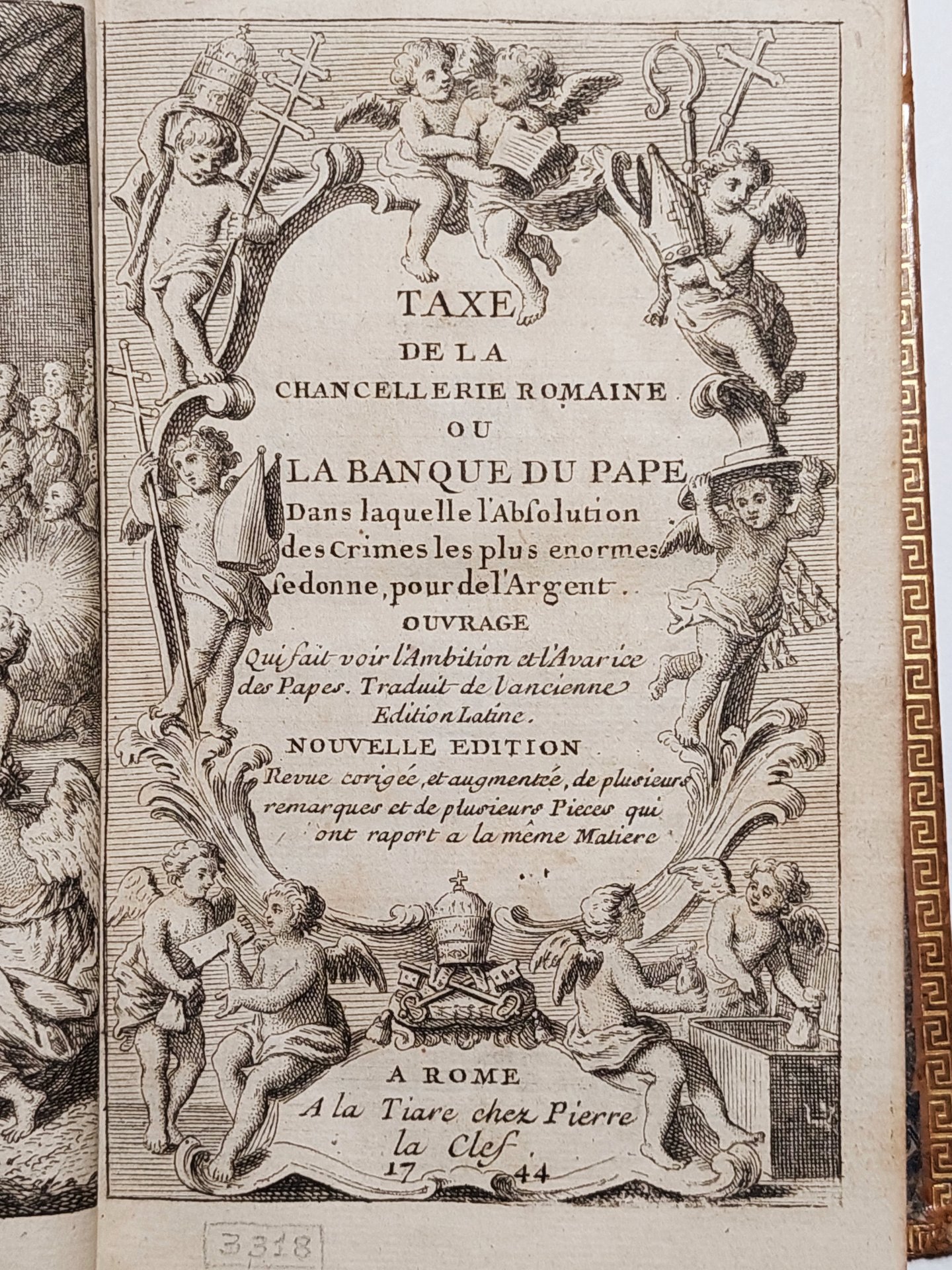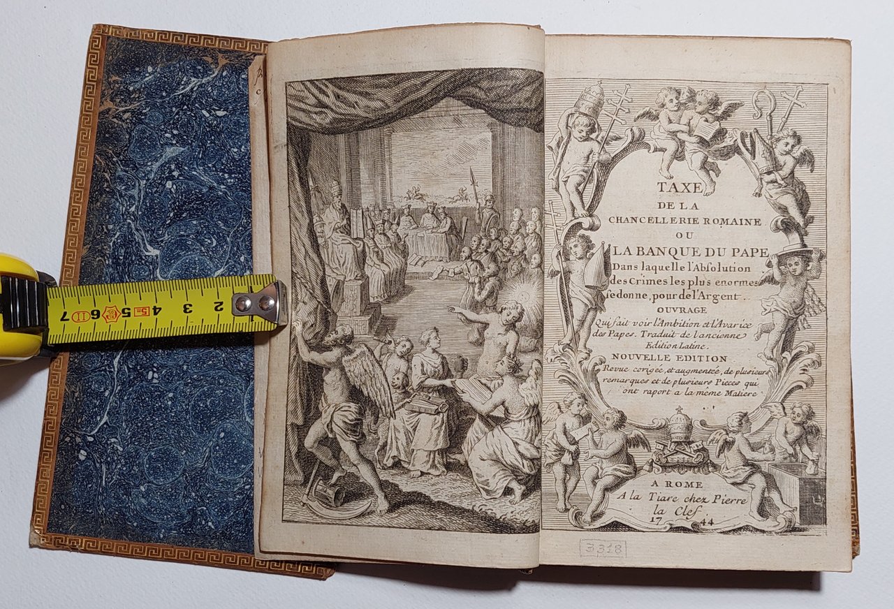 Taxe de la Chancellerie Romaine ou La Banque du Pape, dans laquelle l'Absolution des Crimes les plus enormes se donne pour de l'Argent. Ouvrage qui saisit l'Ambition et l'Avaricie des Papes. Traduit de l'ancienne Edition Latine. Nouvelle edition revue, corrigée et augmentée de plusieurs remarques et de plusieurs Pieces qui ont raport a la même Matière Roma 1744.