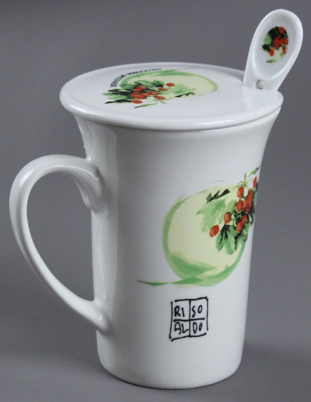 (Codice ZZ/0096) Dimensioni tazza: H cm 10,5, diametro max cm 8 + manico. Coperchio diametro cm 8,5. Cucchiaino lungo cm 13,5. Peso gr 312. Stato di nuovo. ~~~ SPEDIZIONE IN ITALIA SEMPRE TRACCIATA