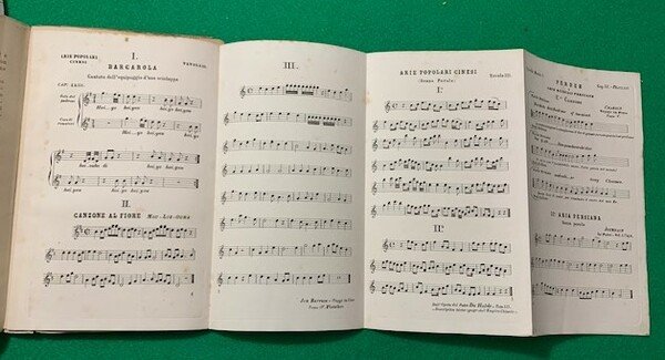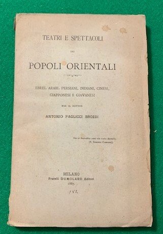 In 4°; XI, (3),278, (2) pp. e una c. di tav. più volte ripiegata con musica e testo della barcarola.Brossura editoriale con titolo impresso in nero al piatto anteriore. Dedica dell'autore alla prima carta bianca. Prima edizione di questo interessante scritto del noto critico teatrale, Antonio Brozzi Paglicci dedicato al teatro nella cultura ebraica, araba, persiana, indiana, cinese, giapponese e giavanese. Esemplare in ottime condizioni di conservazione ed ancora a fogli chiusi.