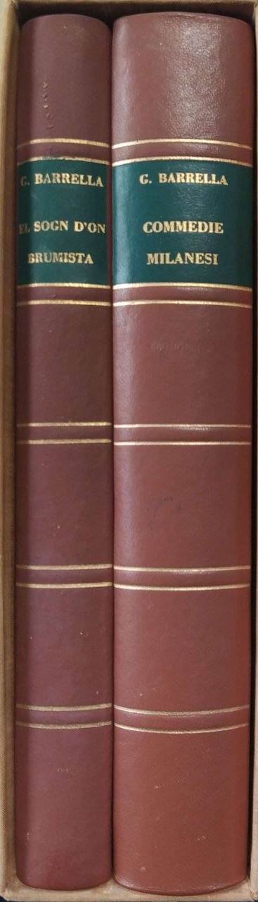 In-8 gr., 2 volumi, mz. pelle editoriale, titolo oro al dorso, cofanetto. Il cofanetto contiene:1: El sogn don brumista, La Prora 1936, pp. 264.2: Commedie milanesi, Ghezzi 1967, pp. 462. Il milanese Giovanni Barrella (1884-1967), grande appassionato di teatro, alternerà questa passione con quella della poesia e della pittura. In ottimo stato (nice copy).