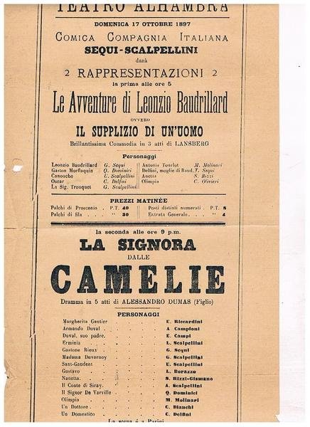 Teatro Alhambra, domenica 17 ottobre 1897 la compagnia italiana Sequi-Scalpellini darà 2 rappresentazioni de le avventure di Leonzio Baudrillard, ovvero il supplizio dell'uomo, commedia brillante in 3 atti di Lansberg. La seconda La signora dalle Campelie dramma in 5 atti di A. Dumas figlio.