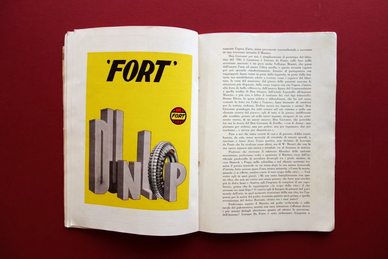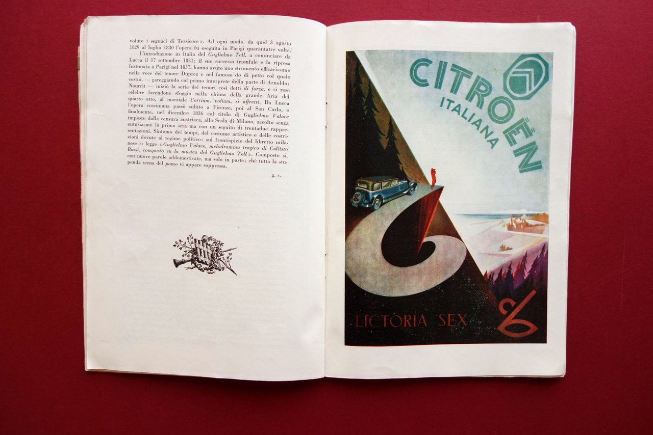 Libretto - programma ufficiale, Teatro alla Scala programma ufficiale stagione 1929 - 1930 A cura del Museo Teatrale - Edizione Utilissima - Arti Grafiche Pizzi & Pizio, Milano 1929; cm 24x17; pp. 76 non num. con numerose inserzioni pubblicitarie a piena pagina, sia in b/n che con bella grafica a colori (Hartmann, Citroen, Alfa Romeo, Eugene, Dunlop, ecc.); brossura ed. Condizioni di conservazione Condizioni complessivamente buone con tracce d'uso, brossura con alcune minime bruniture, una piccola / minima mancanza agli angoli superiori; alla cuffia inf. strappetto di circa 4 cm (esemplare compatto). Interni buoni con alcune minime bruniture alle prime e alle ultime pagine. Corredata da varie belle tavole pubblicitarie a colori fuori testo di importanti marchi e aziende: Citroen, Hartmann, Alfa Romeo, Eugene, Dunlop, ecc. (vedi foto). OPEB.5555 N