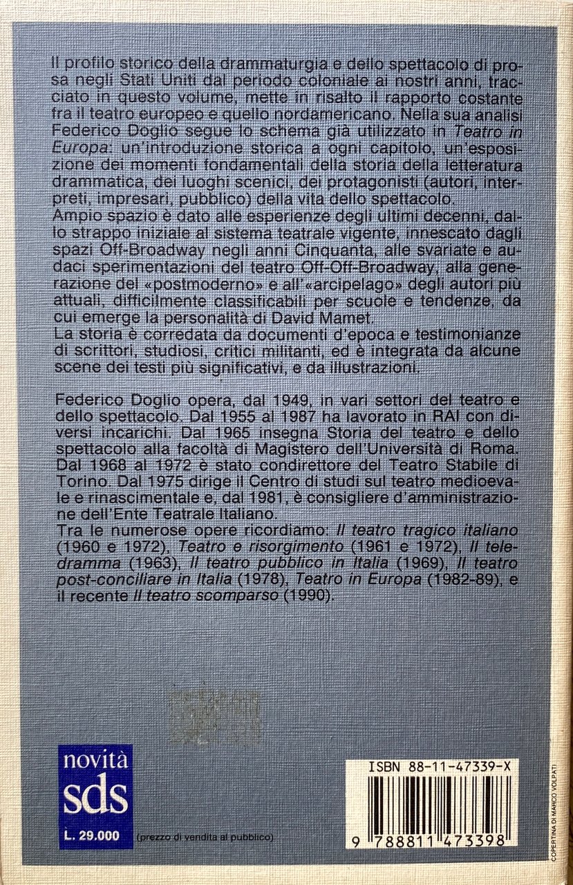 Il profilo storico della drammaturgia e dello spettacolo di prosa negli Stati Uniti dal periodo coloniale ai nostri anni, tracciato in questo volume, mette in risalto il rapporto costante fra il teatro europeo e quello nordamericano. Nella sua analisi Federico Doglio segue lo schema già utilizzato in Teatro in Europa: un'introduzione storica a ogni capitolo, un'esposizione dei momenti fondamentali della storia della letteratura drammatica, dei luoghi scenici, dei protagonisti (autori, interpreti, impresari, pubblico) della vita dello spettacolo. Ampio spazio è dato alle esperienze degli ultimi decenni, dallo strappo iniziale al sistema teatrale vigente, innescato dagli spazi Off-Broadway negli anni Cinquanta, alle svariate e audaci sperimentazioni del teatro Off-Off-Broadway, alla generazione del postmoderno e all'arcipelago degli autori più attuali, difficilmente classificabili per scuole e tendenze, da cui emerge la personalità di David Mamet. La storia è corredata da documenti d'epoca e testimonianze di scrittori, studiosi, critici militanti, ed è integrata da alcune scene dei testi più significativi, e da illustrazioni.