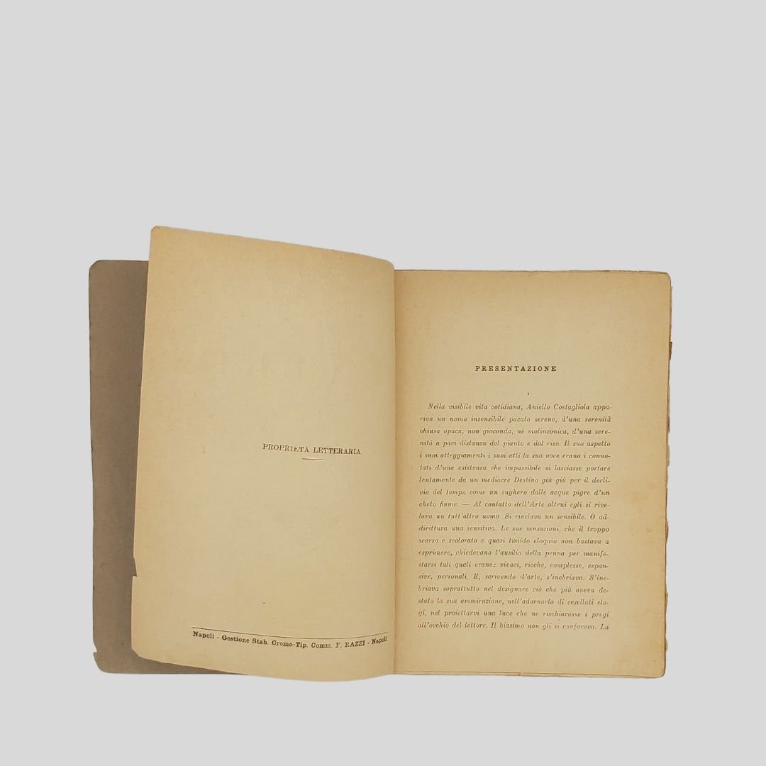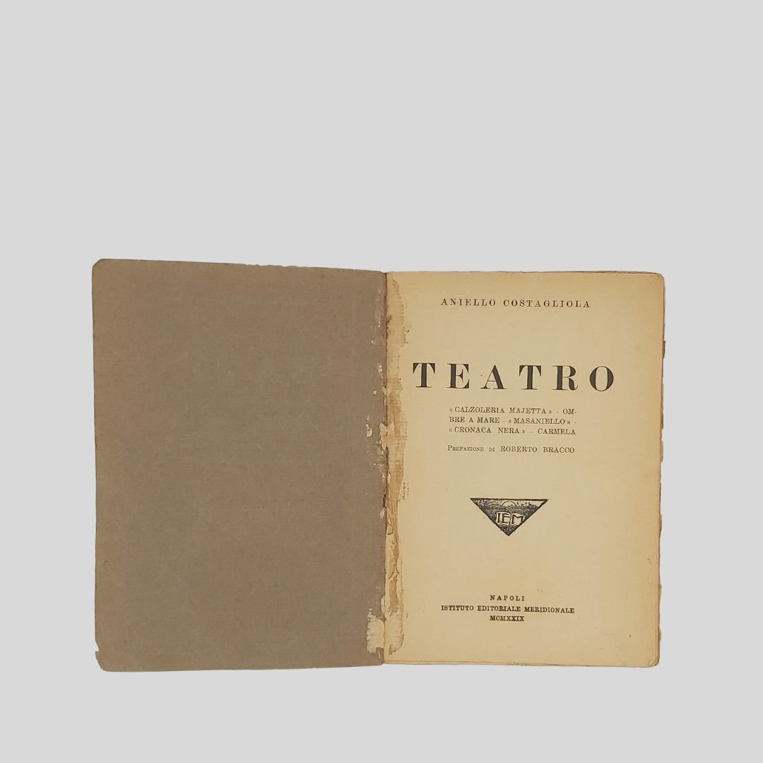 In-16° (cm 19), pp. X-185-(3). Tracce d’uso alla cop. e al frontespizio, ma buon esemplare. Edizione pubblicata postuma. Non comune. «L’arte di Aniello Costagliola, autore tragico, tendeva a sollevare, non per programma, ma per impulso istintivo il teatro dialettale napoletano all’importanza del “teatro di pensiero” […] Quando si avanza il Pensiero, le folle fuggono» [dalla pref. di Roberto Bracco] Aniello Costagliola [Napoli 1871 -ivi 1928]. Drammaturgo, esponente di rilievo del “teatro d’arte napoletano” assieme a Roberto Bracco, Ernesto Murolo, Salvatore Di Giacomo, F. G. Starace…Tra le sue pubblicazioni si ricorda Napoli che se ne va. Il teatro, la canzone. Napoli, Giannini, 1918.