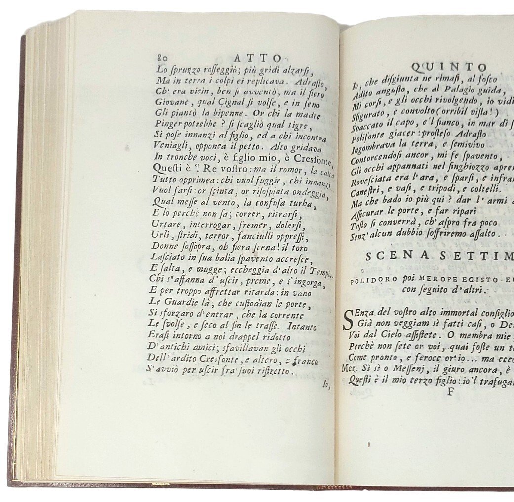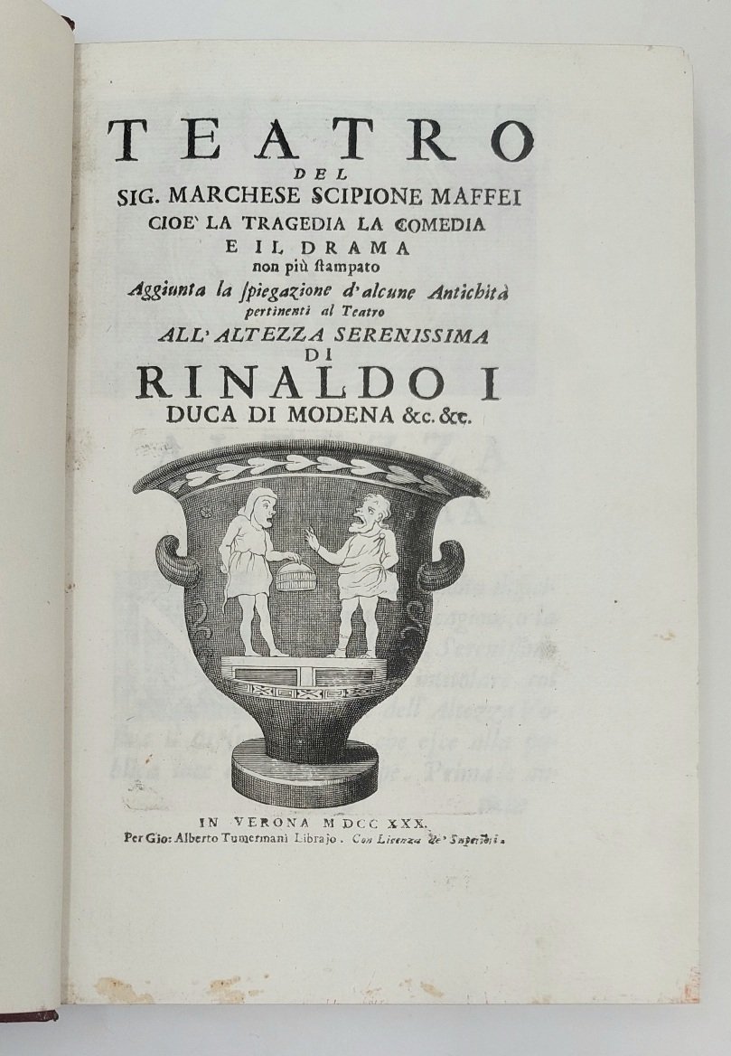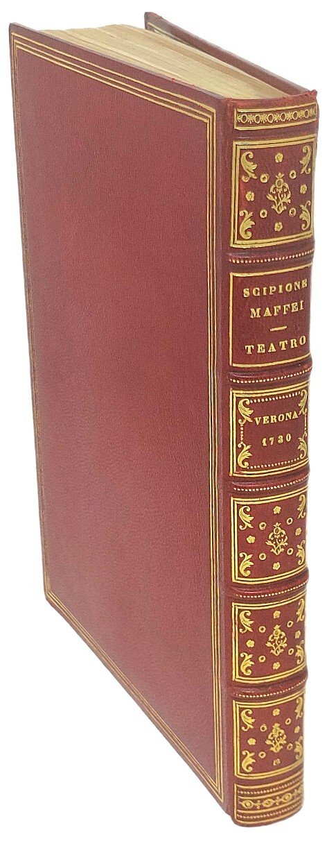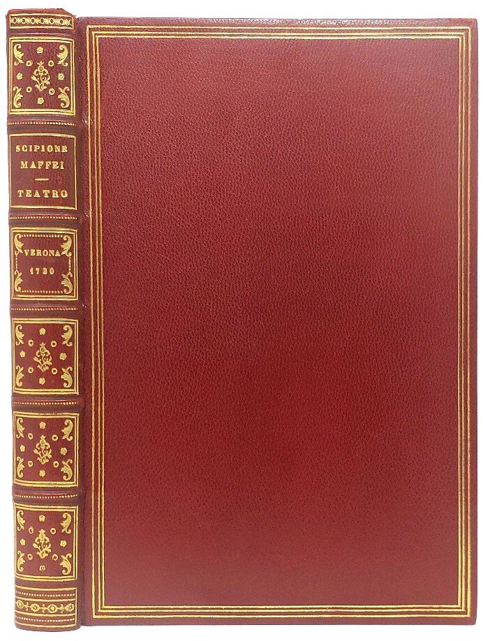 >3 parti in un vol. in-8, pp. XLI, (3), 281, (1), legatura d'amatore firmata in marocchino granata, bordura a filetti oro sui piatti, dorso a nervi con tit. e ricchi fregi oro, tagli dor., in custodia cart. Vignetta inc. sul titolo generale, ritratto in medaglione del Duca di Modena Rinaldo I, cui l'edizione è dedicata dallo stampatore, vignetta inc. su ciascuno dei tre titoli (all'inizio, a pag. 85 e 191), una tav. ripieg. f.t. ed altra vignetta a pag. 277; iniz. e fregi silogr., testo in car. corsivo. Prima edizione collettiva, accuratamente impressa, di tre fra i più significativi prodotti teatrali del dotto poligrafo veronese (1675-1755), tutti preceduti da alcune pagine di presentazione di Giulio Cesare Becelli, curatore di questa rara e ''pregevole edizione'' (Gamba). In fine si legge la ''Lettera di Maffei a G. C. Becelli sopra i rametti posti ne' frontispizi di questo volume''. Ottimo esemplare Cat. Rasi n. 443. Soleinne 4526: «Edition recherchée''. Gamba 2323.