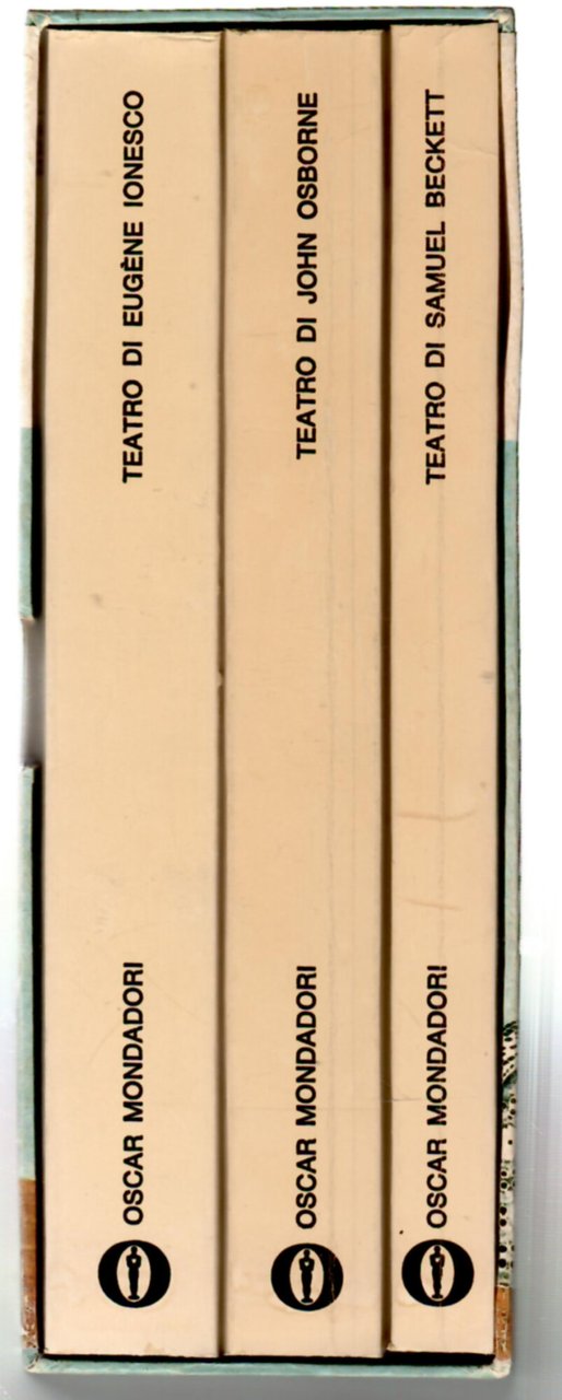 Collana Oscar, cofanetto contenente tre volumi  con le principali opere dei tre drammaturghi ( Beckett: Aspettando Godot, Finale di partita, L'ultimo nastro di Krapp, Giorni felici. Ionesco: La Cantatrice calva, La lezione, Amedeo o Come sbarazzarsene, L'improvviso dell'Alma ovvero Il camaleonte del pastore, Zssassino senza movente. Osborne: Ricorda con rabbia, L'Istrione, Materia di scandalo e preoccupazione, Lutero ). Opera in ottime condizioni. Spedizione in 24 ore dalla conferma dell'ordine.