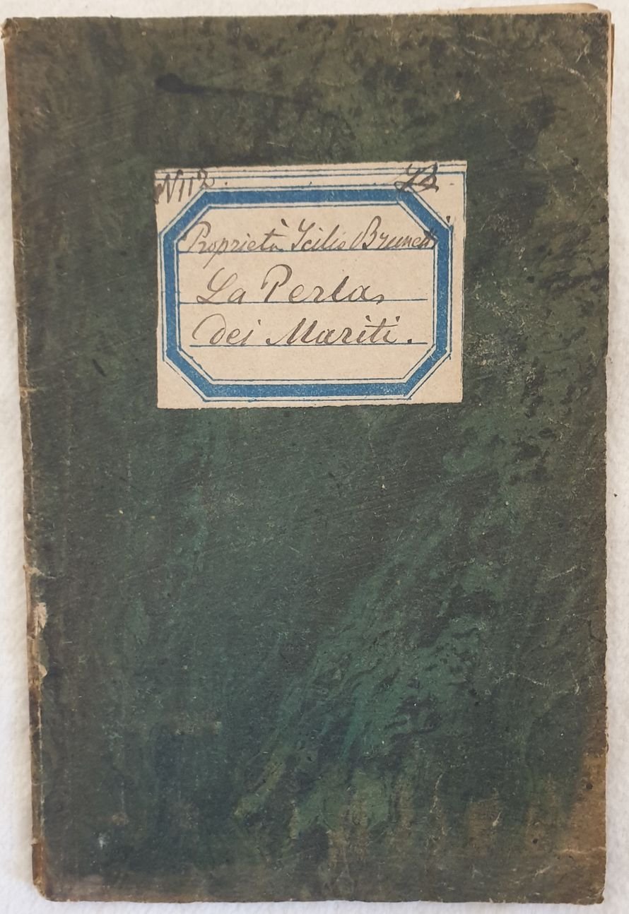 Libretto d'opera del 1858 dell'opera "La perla dei mariti ossia Benedetto e Domiziano" nel Teatro dell'avvocato T. Gherardi del Testa. Note manoscritte. In buone condizioni. Copertina morbida coeva con titolo manoscritto su etichetta in buone condizioni con lievi usure ai margini e dorso. Legatura in buone condizioni. All'interno le pagine si presentano in buone condizioni con rare fioriture. In 16. Dim. 14x9,5 cm. Pp. 26. Booklet of 1858 of the drama "La perla dei mariti ossia Benedetto e Domiziano" in the Teatro dell'avvocato T. Gherardi del Testa. Handwritten notes. In good conditions. Soft coeval cover with handwritten title in the label of cover in fair conditions lightly worn in the extremities. Binding in good conditions. Inside pages are in good conditions with occasional foxing. In 16. Dim. 14x9,5 cm. Pp. 26.
