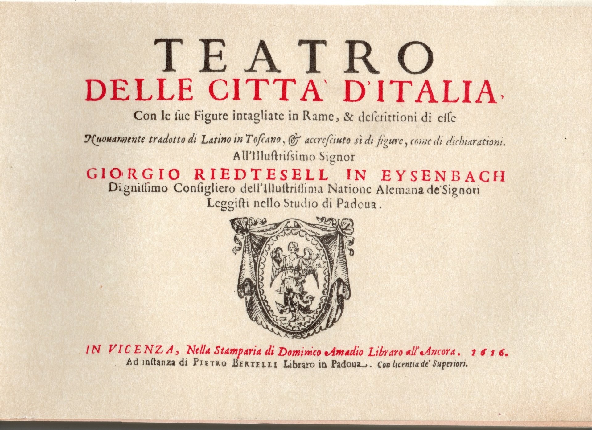 Con le sue Figure intagliate in Rame, & Descrittioni di esse. Nuovamente tradotto di Latino in Toscano. Ristampa Anastatica dell'ed. di Vicenza nella Stamparia di Dominico Amadio Libraro dell'Ancora, 1616.Vivarelli, 1977