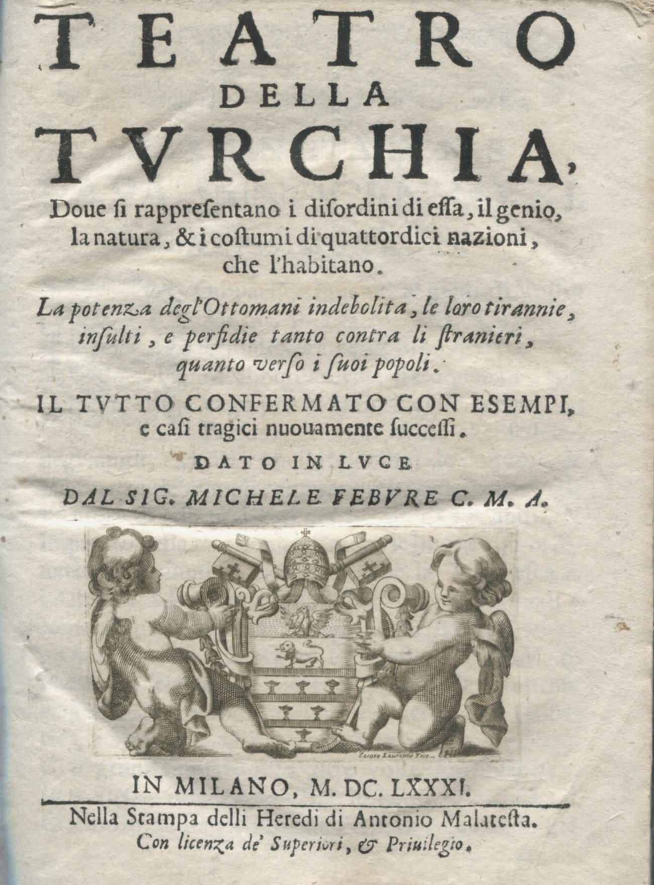 In 4°(mm 220x165); pagg. (18), 530. Grande vignetta in rame al frontespizio con le armi di Innocenzo XI dedicatario dell'opera; capolettera, testatine in xilografia. Mezza pergamena del XVIII secolo, dorso con tassello e titolo in oro, fregi dorati a piccoli ferri; tagli a spruzzo. Prima edizione. <BR>Quest'opera, inesauribile fonte di notizie storiche sui Turchi e loro etnie, è stata redatta dal frate cappuccino francese Justinien de Tours, che si celava sotto lo pseudonimo di Michele Febure da Novi. Bell'esemplare, qualche lieve macchia. Ex libris Biblioteca Sormani Andreani Verri.