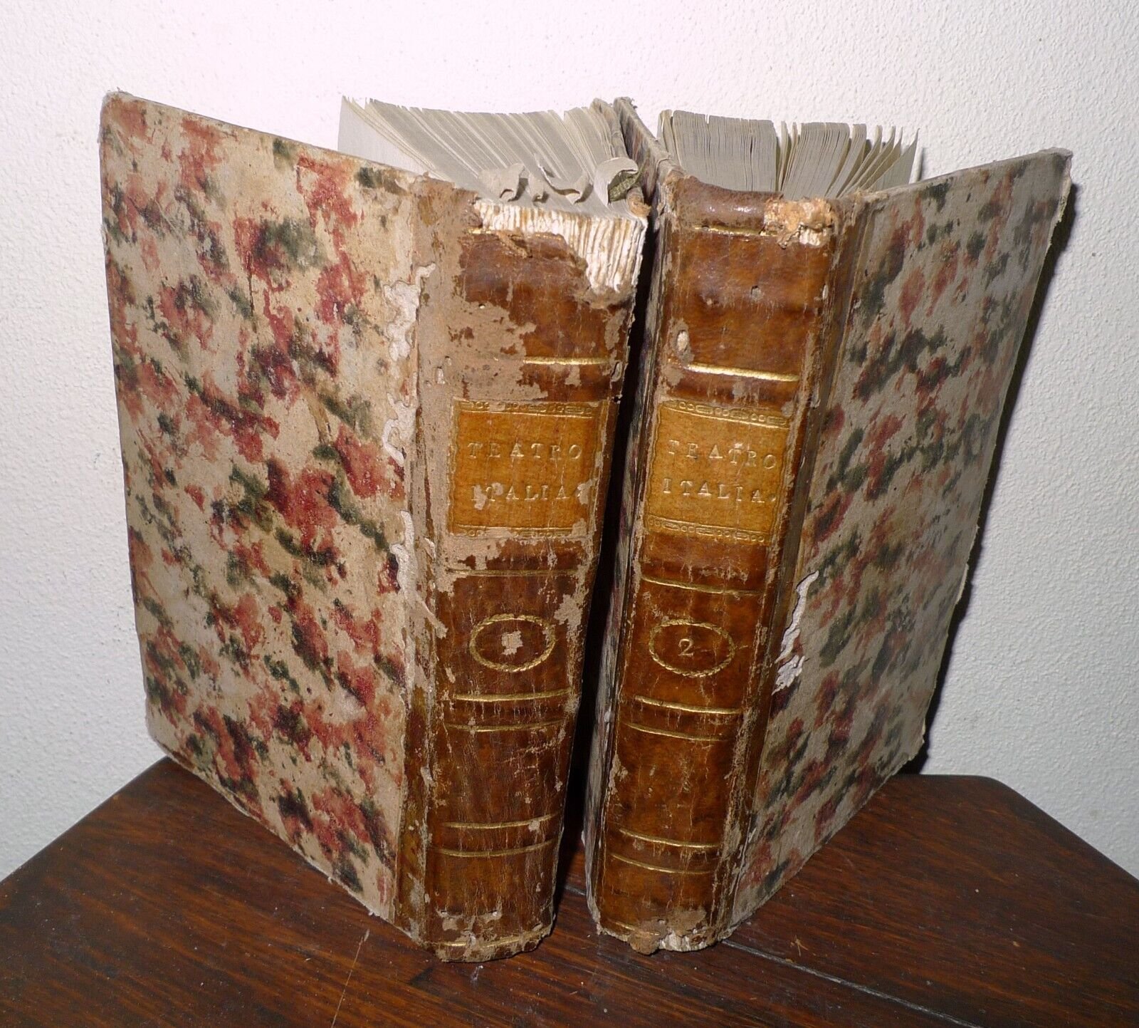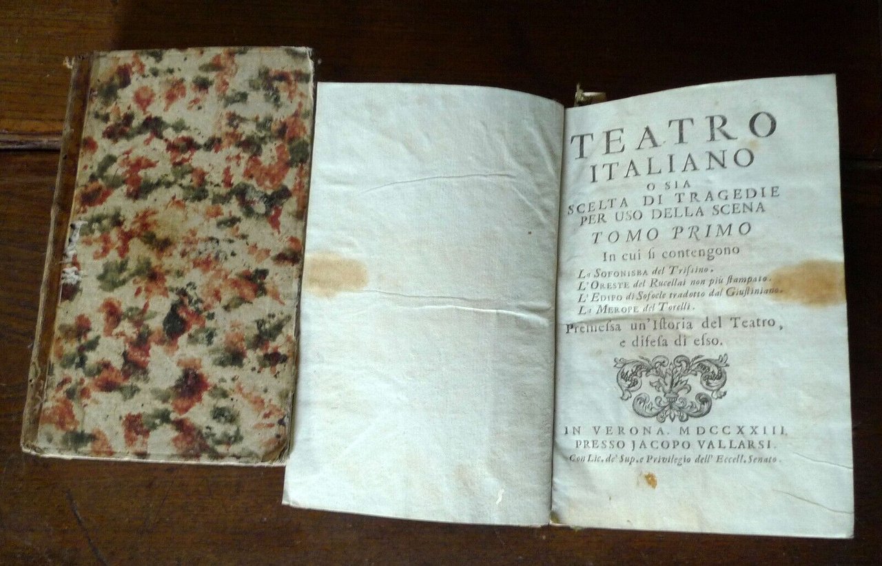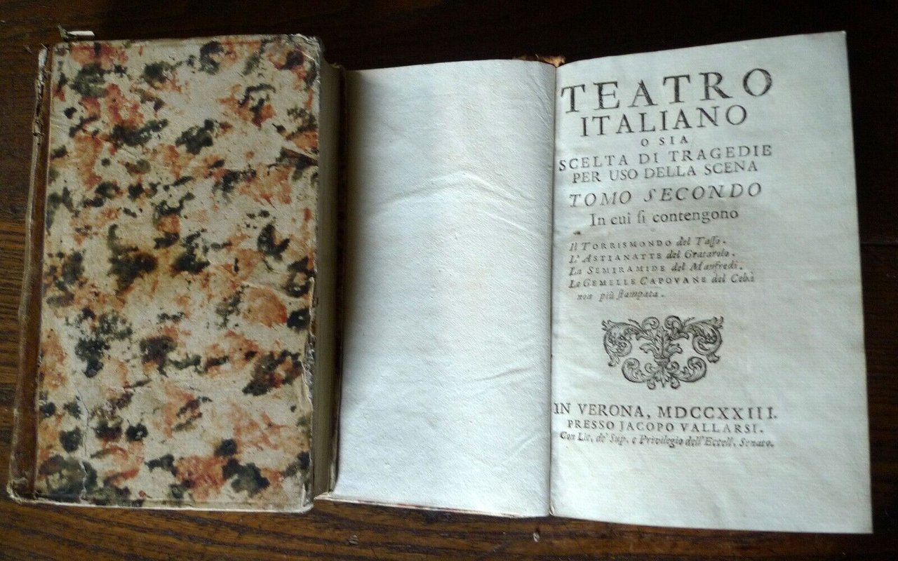 [A cura di Scipione Maffei]TEATRO ITALIANOO SIA SCELTA DI TRAGEDIE PER USO DELLA SCENA- TOMO PRIMOIN CUI SI CONTENGONOLA SOFONISBA DEL TRISSINOL'ORESTE DEL RUCELLAI non più stampatoL'EDIPO DI SOFOCLE tradotto dal GiustinianoLA MEROPE DEL TORELLIPREMESSA UN'ISTORIA DEL TEATRO ,E DIFESA DI ESSO.- TOMO SECONDOIN CUI SI CONTENGONOIL TORRISMONDO DEL TASSOL'ASTIANATTE DEL GRATAROLOLA SEMIRAMIDE DEL MANFREDILE GEMELLE CAPOVANE DEL CEBA non più stampata.[2 TOMI DI 3, OPERA INCOMPLETA].IN VERONA, MDCCXXIII (1723),PRESSO JACOPO VALLARSI,copertina rigida, rilegatura in mezza pelle,16x10,5 cm., TOMO I pp.11,XLIV,403 [le pag.XLI-XLIVsono fra le pag.6 e 7]; TOMO II 424,peso: g.600