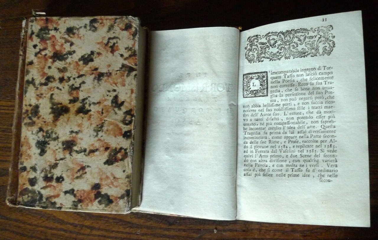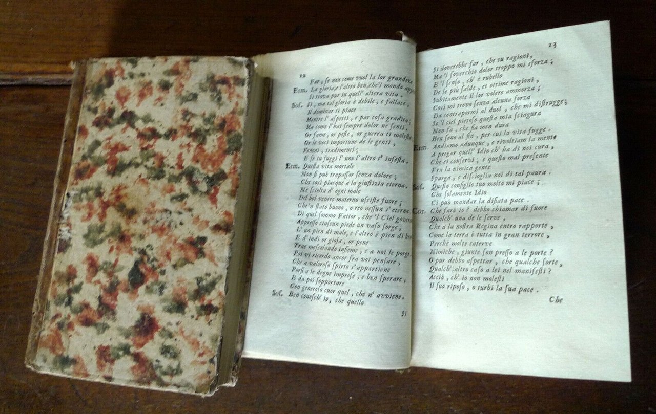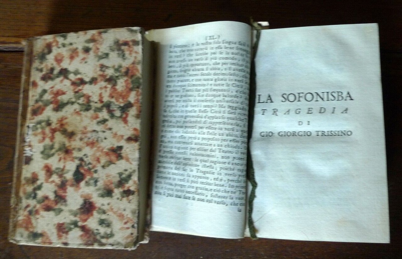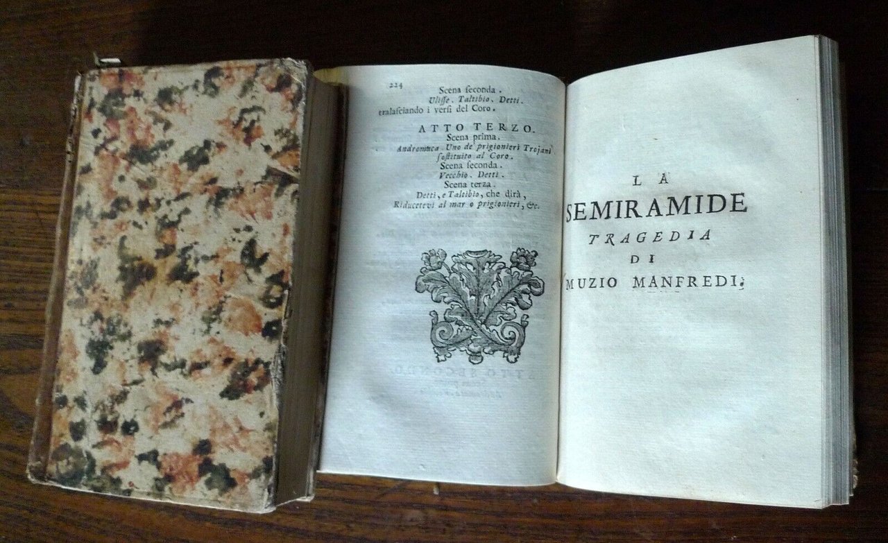 [A cura di Scipione Maffei]TEATRO ITALIANOO SIA SCELTA DI TRAGEDIE PER USO DELLA SCENA- TOMO PRIMOIN CUI SI CONTENGONOLA SOFONISBA DEL TRISSINOL'ORESTE DEL RUCELLAI non più stampatoL'EDIPO DI SOFOCLE tradotto dal GiustinianoLA MEROPE DEL TORELLIPREMESSA UN'ISTORIA DEL TEATRO ,E DIFESA DI ESSO.- TOMO SECONDOIN CUI SI CONTENGONOIL TORRISMONDO DEL TASSOL'ASTIANATTE DEL GRATAROLOLA SEMIRAMIDE DEL MANFREDILE GEMELLE CAPOVANE DEL CEBA non più stampata.[2 TOMI DI 3, OPERA INCOMPLETA].IN VERONA, MDCCXXIII (1723),PRESSO JACOPO VALLARSI,copertina rigida, rilegatura in mezza pelle,16x10,5 cm., TOMO I pp.11,XLIV,403 [le pag.XLI-XLIVsono fra le pag.6 e 7]; TOMO II 424,peso: g.600