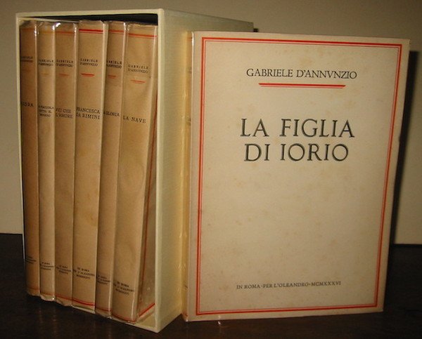8vo (cm. 24,5), 7 Voll. (l’intera edizione). Legatura editoriale in cartoncino bianco ripiegato. Titoli in rosso e nero al dorso e al piatto anteriore. Carta a mano di Fabriano con filigrana ‘Per non dormire’ e timbro a secco ‘Brilla di rose il lauro trionfale’. Edizione di 171 esemplari numerati da 1 a CCLXXXI (nostro C fuor di serie). Eccellente stato di conservazione, volumi intonsi entro cofanetto.