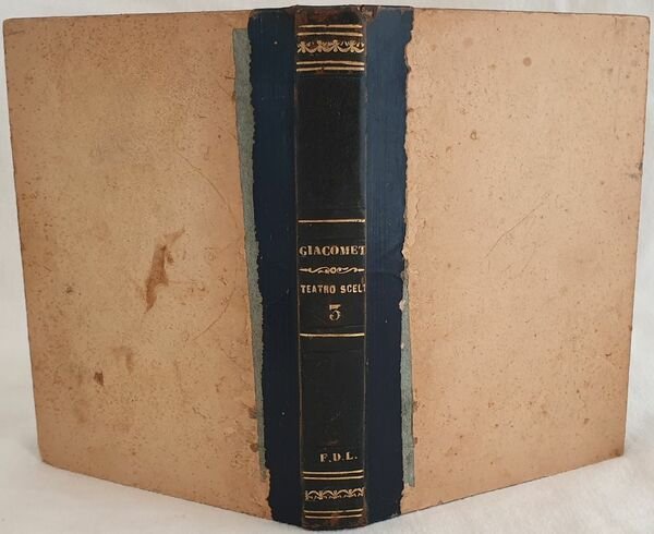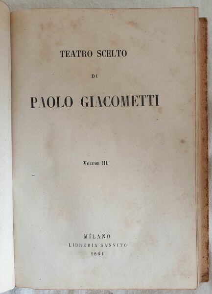 Edizione del 1861 di questa raccolta di commedie del commediografo Paolo Giacometti (1816-1882) nato a Novi Ligure. Giacometti si trasferì a Genova un anno dopo la sua nascita. Tomo terzo solamente. Le commedie presenti all'interno: Bianca Maria Visconti, Le metamorfosi poetiche, Siamo tutti fratelli! ossia il villaggio e la città, Il fisionomista, La trovatella di Santa Maria, Il milionario e l'artista, Cola di Rienzo ecc. In buone condizioni. Copertina in mezza pelle coeva con titolo in oro al dorso in discrete condizioni con lievi usure marginali. Carta mancante ai piatti. Legatura in buone condizioni. Pagine in buone condizioni con fioriture. In 8. Dim. 22,5x16 cm. Pp. 478. Peso Kg. 0,550<BR><BR>