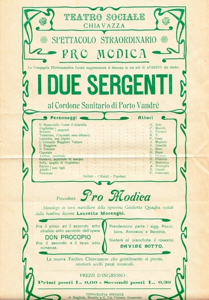 Teatro Sociale Chiavazza. Spettacolo straordinario Pro Modica I due sergenti al Cordone Sanitario di Porto Vandrè. Programma.