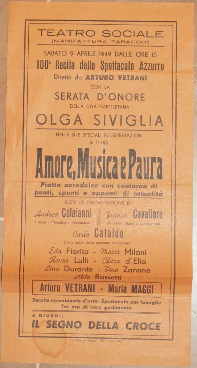 Bella locandina pubblicitaria di una serata del 9 aprile 1949 1949 nel Teatro Sociale (Manifattura tabacchi) a Bari. Il programma: Olga Siviglia, Andrea Colaianni, Franco Cavaliere, Carlo Cataldo, Canzone napoletana: Eda Fiorita, Mario Milani, Renzo Lulli, Clara d'Elia, Lina Durante, Pino Zanone, Aldo Rossetti, Arturo Vetrani, Maria Maggi ecc. In buone condizioni, una macchia. Piegature orizzontali. Formato cm. 32,5x16,5. Beautiful advertising poster of an evening of the 9th of april 1949 1949 in the Teatro Sociale (Manifattura tabacchi) a Bari. The program: "Spettacolo azzurro" of Arturo Vetrani with Maria Maggi and Carlo Cataldo, "Le due madonne" Trio Nobile, Torelli, Alba Meris, "Le ragazze del balletto" (Ines, Mery, Rosy, Hermellin, Tina, Willy, Ketty). In good conditions. Stain and horizontal foldings.
