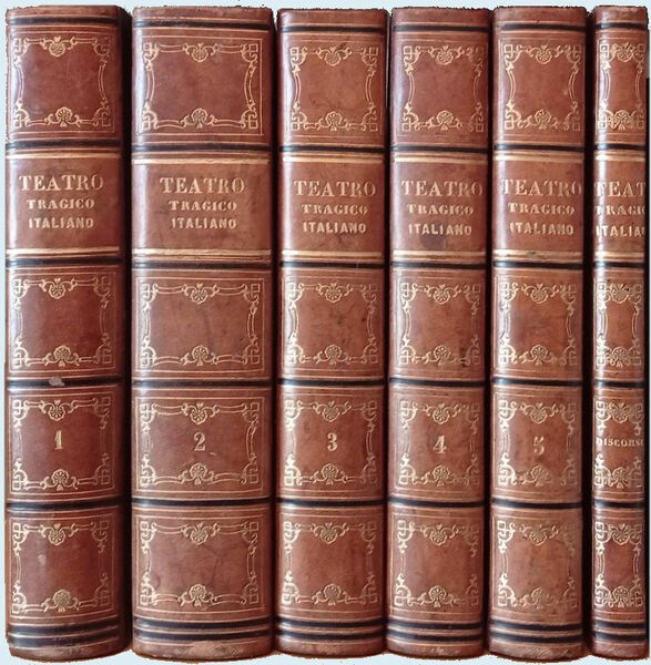 6 vol. in 8, p. [10] 511 [1], [8] 116 - 531 [1], [8] 556, [8] 55 - 470 (da p. 57 a 103 la numerazione è relativa - 1/48 -per poi riprendere), [8] 418, [2] XXXVI - 253; con 252 (su 254) tav. litografiche f. testo (mancano la 5a dell'Oreste e la 5a dell'Alceste dell'Alfieri); leg. ottocentesca in mezza pelle con tit. e decorazioni in oro al dorso. Nel sesto volume, "Discorsi accademici sul teatro tragico del Professor Luigi Firrao." Napoli, 1851.
