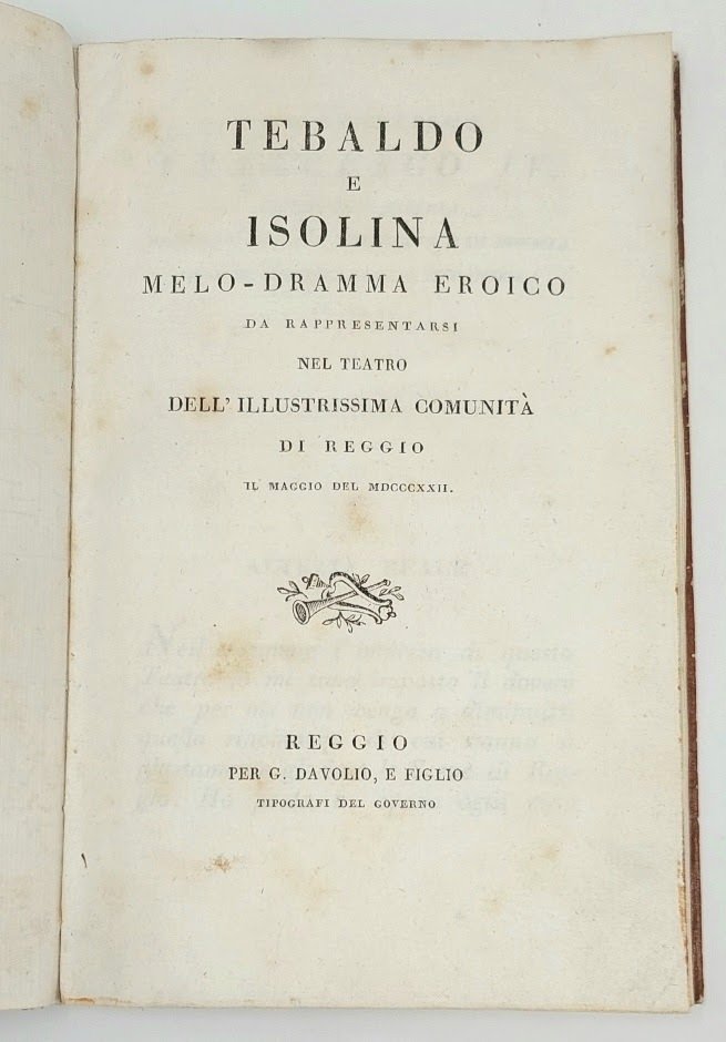 TEBALDO E ISOLINA - melo-dramma eroico da rappresentarsi nel teatro dell'illustrissima comunità di Reggio il maggio MDCCCXXII