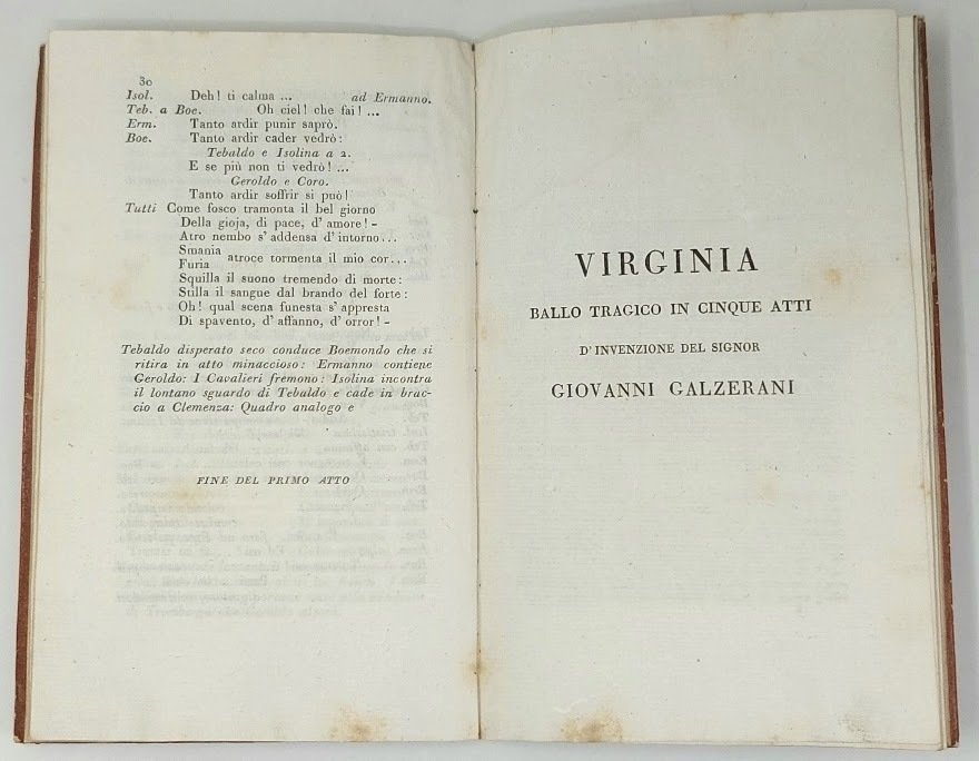 >in-8° mm 200 x 130 pp. 63, legatura originale in cartone color mattone, cornice decorativa dorata ai piatti. Fu questa una delle oltre venti opere musicate da Francesco Morlacchi; rappresentata per la prima volta al Teatro la Fenice di Venezia nel 1822, e a Reggio Emilia nel maggio dello anno (cfr. Dedica L'interpretazione del ruolo principale da parte di Giovanni Battista Velluti contribuì alla diffusione dell'opera, che venne rappresentata nel decennio successivo in più di 40 teatri. Giovan Battista Fattori, messosi a capo di alcuni dilettanti del luogo il 13 gennaio 1775 chiese alla Comunità di poter fare un piccolo Teatro, utilizzando le camere a pian terreno del Palazzo Bentivoglio. I libretti di queste rappresentazioni reggiane, completi dei nomi dei cantanti e dei musicisti, sono rari. Buon esemplare, minime e lievi fioriture sparse.