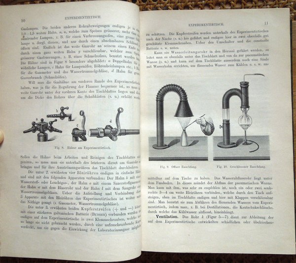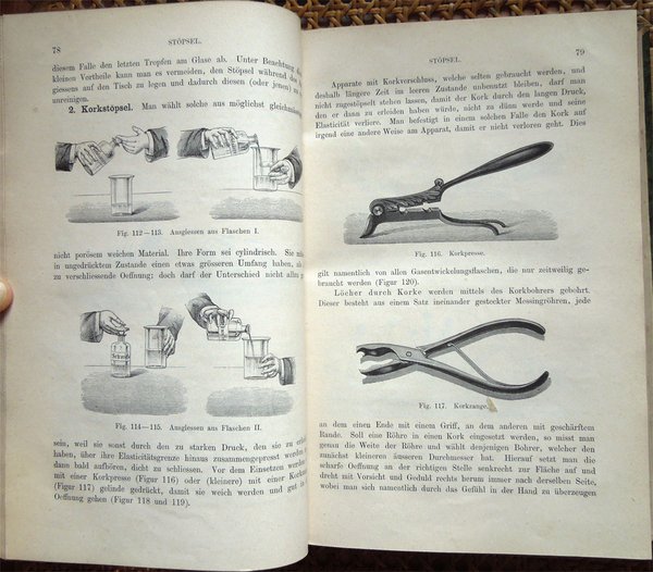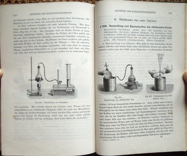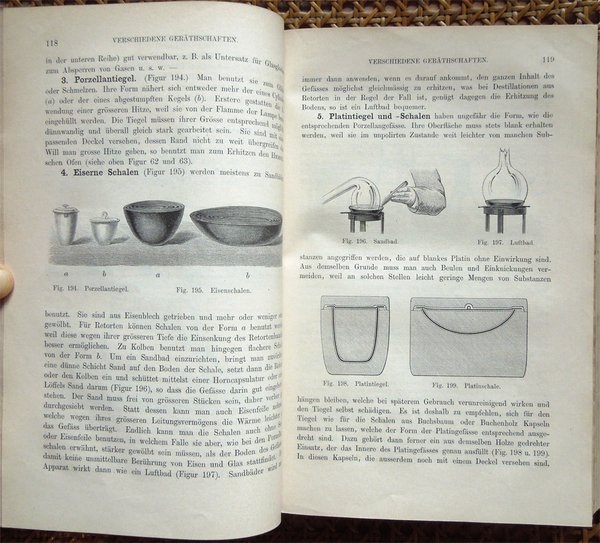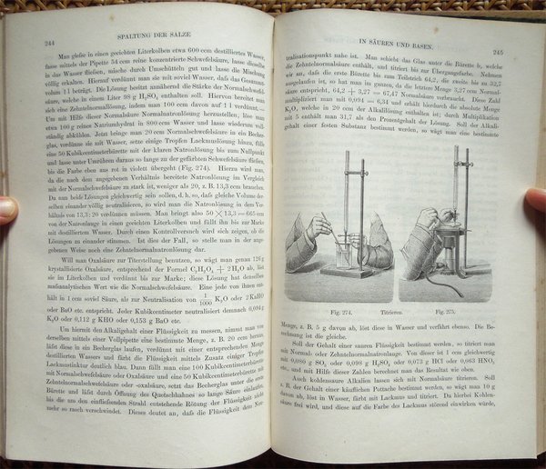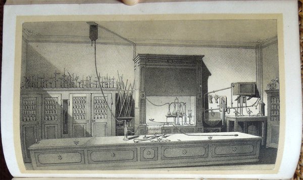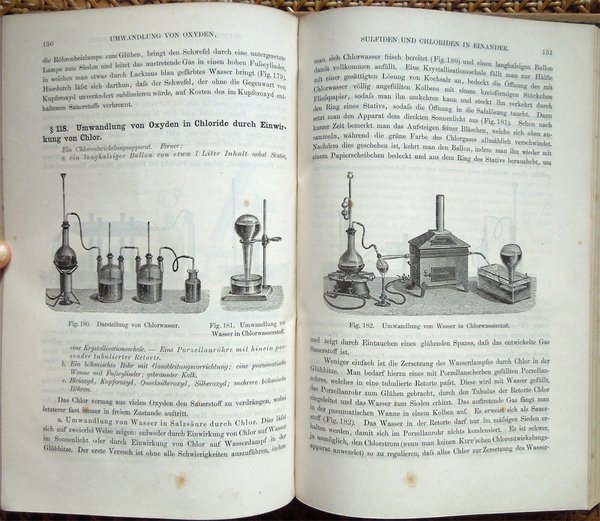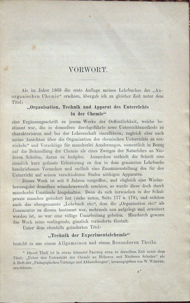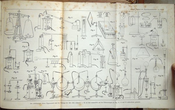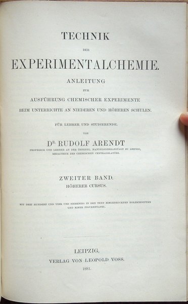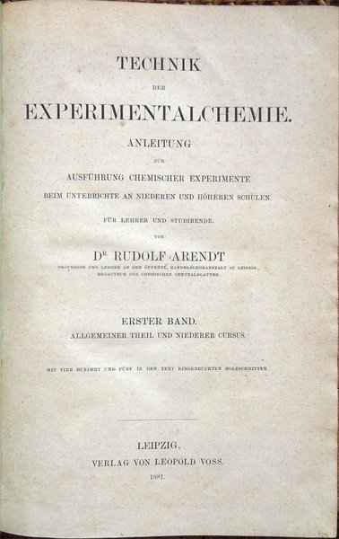 Due volumi, rilegati in uno, in-8° (23,2 x 15,2 cm) pp. CV, (1), 318, (2); XXIV, 411, (1), legatura coeva in mezza tela, con titoli al dorso. Normali tracce d'uso e del tempo alla legatura, in particolare, al piatto anteriore, due piccole mancanze di forma semisferica e una piccola rottura nel margine esterno, alla cerniera posteriore, una piccola rottura alla tela. Con una tavola fuori testo (anziché in antiporta, come in altri esemplari, rilegata tra le pagine 208-209) e 405 figure in bianco e nero al primo volume e una tavola fuori testo, più volte ripiegata e 374 figure nel testo al volume secondo. Lievi segni d'umido ai tagli, foxing ai bordi della tavola fuori testo del volume secondo. Nella parte inferiore di pagina 120 del volume secondo, errore verificatosi in sede tipografica, ma testo completo. Normale patina del tempo alle pagine, alcune delle quali presentano piccoli, lievi segni d'umido, per il resto, ben conservato. Inhalt-Verzeichniss. ERSTER BAND. Vorwort. Einleitung. Allgemeiner Theil. Hörsaal. Experimentirtisch. Abzug. Gasometer. Galvanische Elemente. Gebläse und Aspiratoren. Lampen. Glasröhren. Stöpsel. Filtrirvorrichtungen. Kautschukröhren. Gasentwickelungsapparate. Reinigung der Apparate. Verschiedene Geräthschaften. Glasapparate. Geaichte und Graduirte Glasgefässe. Röhrenträger und -halter, Tischchen, Retortenhalter, Stative. Destillation. Allgemeine Bemerkungen. Besonderer Theil. I. Niederer Cursus. Vorbemerkung. Erste Stufe. Ueberblick. Versuche. 1. Kochsalz. 2. Zucker. 3. Kochsalz und Zucker. 4. Sand. 5. Sand und Salz. 6. Thon. 7. Thon und Sand. Begriffe, Thatsachen und Gesetze. Zweite Stufe. Ueberblick. 8. Soda. 9. Pottasche. 10. Glaubersalz und Bittersalz. 11. Salpeter. 12. Gyps. 13. Marmor. 14. Kreide und Kalkstein. Begriffe, Thatsachen und Gesetze. Dritte Stufe. Ueberblick. A. Chemische Erscheinungen. 15. Chlorkalk. 16. Alaun. 17. Kupfervitriol. 18. Eisenvitriol. 19. Galläpfel. 20. Blutlaugensalz. 21. Kleesalz und Kleesäure. Begriffe, Thatsachen und Gesetze. B. Physikalische Erscheinungen. 22 bis 25. Weingeist und Aether. Sieden und Destilliren. 26 bis 29. Schwefel, Salmiak und Hirschhornsalz. Sublimation. Flüchtige und nichtflüchtige Körper. 30 bis 34. Verdunstungskälte, atmosphärische Niederschläge. Wärmestrahlung, Wärmeleitung, Ausdehnung durch die Wärme, Ventilation. Begriffe, Thatsachen und Gesetze. Vierte und Fünfte Stufe. Ueberblick. Versuche. 35 bis 40. Gase in Wasser. Salzsäure, Ammoniak, Essigsäure, Schwefelsäure und Salpetersäure. Verhalten der Säuren zu Soda, Pottasche, Kalkstein, Marmor, Kreide. 41 bis 45. Sauerstoff, Stickstoff, Essigsäure, Schwefelsäure, Salpetersäure, Chlor und Wasserstoff. Begriffe, Thatsachen und Gesetze. Sechste und Siebente Stufe. Ueberblick. 59 und 60. Kohle, Harze, Balsame und ätherische Oele. Fette. 61 bis 63. Fette, Seifen, Fettsäuren, Plfaster, Firniss und Glycerin. Apparat. ZWEITER BAND. Inhalt. Erster Abschnitt. Oxydationserscheinungen. Entstehung binärer Verbindungen. Elemente. Erstes Kapitel. Die bekanntesten Metalle und ihr Verhalten beim Erhitzen an der Luft. I. Unedle Metalle. II. Edle Metalle. III. Legierungen. Zweites Kapitel. Ursachen der Veränderung der unedlen Metalle beim Erhitzen an der Luft. Drittes Kapitel. Veränderung der Luft bei ihrer Einwirkung auf Metalle. Viertes Kapitel. Einige nichtmetallische und metallische brennbare Körper. I. Nichtmetalle. Fünftes Kapitel. Langsame Verbrennung; unvollkommene Verbrennung. Zweiter Abschnitt. Sulfide und Chloride (Jodide, Bromide, Fluoride). Reduktionen. Erstes Kapitel. Sulfide. Zweites Kapitel. Chloride. Drittes Kapitel. Reduktionen. I. Reduktion der Oxyde. II. Reduktion der Sulfide. III. Reduktion der Chloride, Bromide, Jodide. Viertes Kapitel. Reduktion (Spaltung) mittels Elektricität (Elektrolyse). Fünftes Kapitel. Vielfache Verhältnisse. Oxydationsreihe des Kohlenstoffs. Sechstes Kapitel. Umwandlung von Oxyden, Sulfiden und Chloriden in einander. I. Durch Sauerstoff, Schwefel, bez. Chlor. II. Durch Einwirkung von Wasser, Chlorwasserstoff, bez. Schwefel- wasserstoff. Siebentes Kapitel. Stöchiometrie. Dritter Abschnitt. Salze. Erstes Kapitel. Darstellung von Salzen aus Säuren und Basen. I. Hydrate; Reaktionen auf nassem Wege. II. Darstellung von Oxysalzen durch Einwirkung von Säuren auf Basen. III. Darstellung von Haloidsalzen auf nassem Wege durch Ein- wirkung von Hydrosäuren auf Oxybasen. IV. Allgemeine Eigenschaften der Salze. V. Krystallwasser. VI. Natur der Salze. Zweites Kapitel. Darstellung von Salzen durch Einwirkung von Säuren auf Metalle. Drittes Kapitel. Spaltung der Salze in Säuren und Basen. I. Zersetzung der Salze durch Erhitzen. II. Zersetzung von löslichen Oxy- und Haloidsalzen durch Basen. III. Zersetzung von Oxy- und Haloidsalzen durch Säuren. IV. V. Maßanalyse. Viertes Kapitel. Zersetzung von Salzen bis herab zum Metall. Vierter Abschnitt. Partielle Oxydationen, Chlorierungen etc. und Reduktionen, Spaltungen und Umsetzungen im Radikal. Erstes Kapitel. Oxydationsmittel. I. Schwefelsäure als Oxydationsmittel. II. Oxyde des Stickstoffs als Oxydationsmittel. III. Oxyde des Chlors als Oxydationsmittel. IV. Höhere Metalloxyde als Oxydationsmittel. Zweites Kapitel. Reduktionsmittel. I. Partielle Reduktion durch Metalle. Drittes Kapitel. Halogene, Ozon und Wasserstoffsuperoxyd als Oxydationsmittel. I. Oxydation durch Halogene. II. Ozon als Oxydationsmittel. Viertes Kapitel. Anwendung der partiellen Reduktionen und Oxydationen zur Mafs- analyse. Fünfter Abschnitt. Wasserstoffverbindungen (Hydrüre). Erstes Kapitel. Hydrüre der Halogengruppe. Zweites Kapitel. Hydrüre der Sauerstoffgruppe. Drittes Kapitel. Hydrüre der Stickstoffgruppe. I. Ammoniak und Ammonium. II. Phosphorwasserstoff und Phosphonium. III. Arsen- und Antimonwasserstoff. Viertes Kapitel. Hydrüre der Kohlenstoffgruppe. I. Sumpfgas (Grubengas, Methan). II. Ölbildendes Gas (Äthylen). III. Leuchtgas. IV. Siliciumwasserstoff. Ti