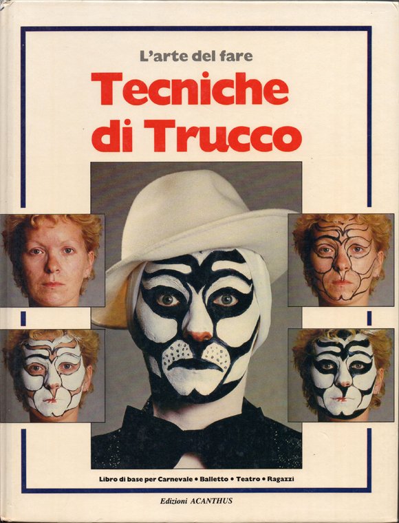 In-8° (27,2 x 21 cm), pp. 96, legatura editoriale illustrata. Normali segni d'uso e del tempo alla legatura, in particolare, piccolissima fenditura, di 0,5 cm nella parte superiore delle cerniere. Con numerose illustrazioni a colori nel testo. Piccoli segni d'umido a pagina 1, bianca, per il resto, ben conservato. Indice. Introduzione. Strumenti e materiali. Alcune teorie. Anatomia. Colore. Illuminazione. Luce colorata. Caldo e freddo. Chiaro e scuro. Le tecniche base. Nase kit. Glatzan. Ferite grandi. Ferite in caucciù. Crespo. Basette. Come mettere una parrucca. Parrucche in sisal. Invecchiamento. Uomo. Donna. Trucco per bambini e feste mascherate. Fiori. Bambola. Fatina. Gatto con gli stivali. Gnomo. Strega. Trucco animali. Gatto. Cane. Pantera. Topo. Leone. Trucco di tipi di vario genere. Clochard. Teschio. Punk. Corsaro. Diavolo o Dracula. Babbo Natale. Trucco di razze diverse. Cinese. Geisha. Arabo. Negra. Indiano. Trucchi diversi. Trucco per il balletto. Charleston. Travestimenti. Trucco fantasia. Fantasia in argento e nero. Maschera pechinese. Fantasia in verde. Clown e Pierrot. Clown. Pierrot.