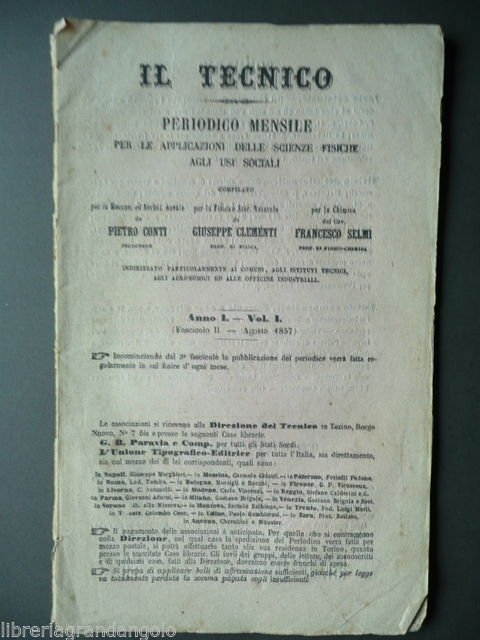 Vedere la descrizione dettagliata Conti Pietro, Dei vantaggi e degli scapiti che i Piroscafi a ruote e quelli ad elice hanno gli uni sugli altri secondo l'uso a cui sono destinati" articolo di pp. 14 in "Il Tecnico", periodico mensile per le applicazioni delle Scienze fisiche agli usi sociali, Anno 1, 1857, vol. 1, fascic. II, Direzione del Tecnico, Torino, cm. 14x22,5, pp. da 41 a 80, br. ed. Condizioni di conservazione Esemplare con usali traccie d'uso, mancanze al dorso fessurato ma non sciolto,minimi difetti ai margini,qualche pieghetta agli angoli, interni con qualche brunitura. Altri articoli: "Delle macchine a vapore dette rigeneratrici - Sistema Siemens"; "Freno a vapore per le vie Ferrate - Sistema Guyet", pp. 2. Per altri volumi e documenti su questo e altri argomenti visitate il negozio "Libreria Grandangolo" su CONDIZIONI DI VENDITA Spedizione Fino a 5 kg piego di libri raccomandato, oltre i 5 kg pacco postale. Si ricorda che l'imballo viene eseguito con la massima cura. La merce viene spedita a pagamento avvenuto e viaggia a rischio e pericolo dell'acquirente. Per maggiori informazioni vedi la pagina SPEDIZIONI del nostro negozio. Ritiro diretto Siamo disponibili per il ritiro diretto a Modena e a Milano. Per gli indirizzi delle sedi vedi la pagina DOVE SIAMO del nostro negozio. Acquisti multipli Se si acquistano più libri, la spedizione si paga una sola volta, purché si rispettino gli scaglioni di peso. Estero / Foreign For international shipment, please contact us. Metodo di pagamento Pay Pal, bonifico bancario, versamento postale (cc/p, vaglia o altro). La spedizione avverrà entro i primi 4 giorni lavorativi dopo la conferma di avvenuto pagamento. Si emette ricevuta fiscale e a richiesta fattura. Il pagamento deve essere effettuato entro 7 giorni lavorativi dalla data di acquisto, trascorsi i quali l'oggetto sarà rimesso in vendita. Feedback Viene rilasciato dall'acquirente dopo il ricevimento di quanto acquistato. Data la sua importanza, vi invitiamo a leggere il breve testo della pagina FEEDBACK del nostro negozio. Pertanto, in caso di qualsiasi problema, non esitate a contattarci. Diritto di recesso L'acquirente ha il diritto di restituire l'oggetto entro 14 giorni ed essere rimborsato, escluse le spese di porto e imballo. L'oggetto deve essere restituito, dopo previa comunicazione, imballato e nelle medesime condizioni di come era all'origine. Creato da Turbo Lister Strumento gratuito per mettere in vendita i tuoi oggetti. Metti in vendita i tuoi oggetti in modo facile e veloce e gestisci le inserzioni in corso. "
