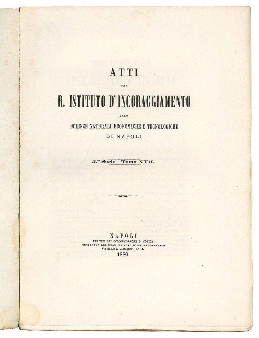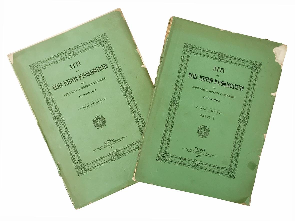 Due volumi in 4to (mm 414x324); pp. [5], 54-307, [1]; [7], 6-191, [1]. Ogni volume è dotato di proprio occhietto e frontespizio. Brossura editoriale con titolo entro cornice alla copertina anteriore e al dorso. Piccole mancanze marginali alle copertine e ai dorsi. Copertine staccate al primo volume, staccata la copertina posteriore del secondo. Un po' sciolti, ma nel complesso buoni esemplari ancora a fogli chiusi. Fa parte di "Atti del Reale Istituto d'incoraggiamento alle scienze naturali, economiche e tecnologiche di Napoli. 2.da Serie - Tomo XVII".