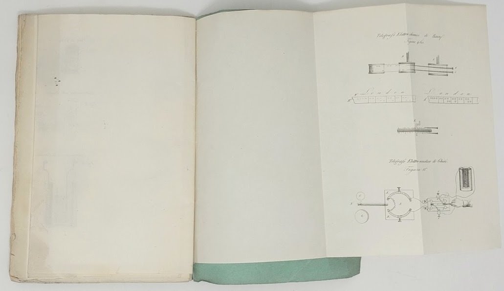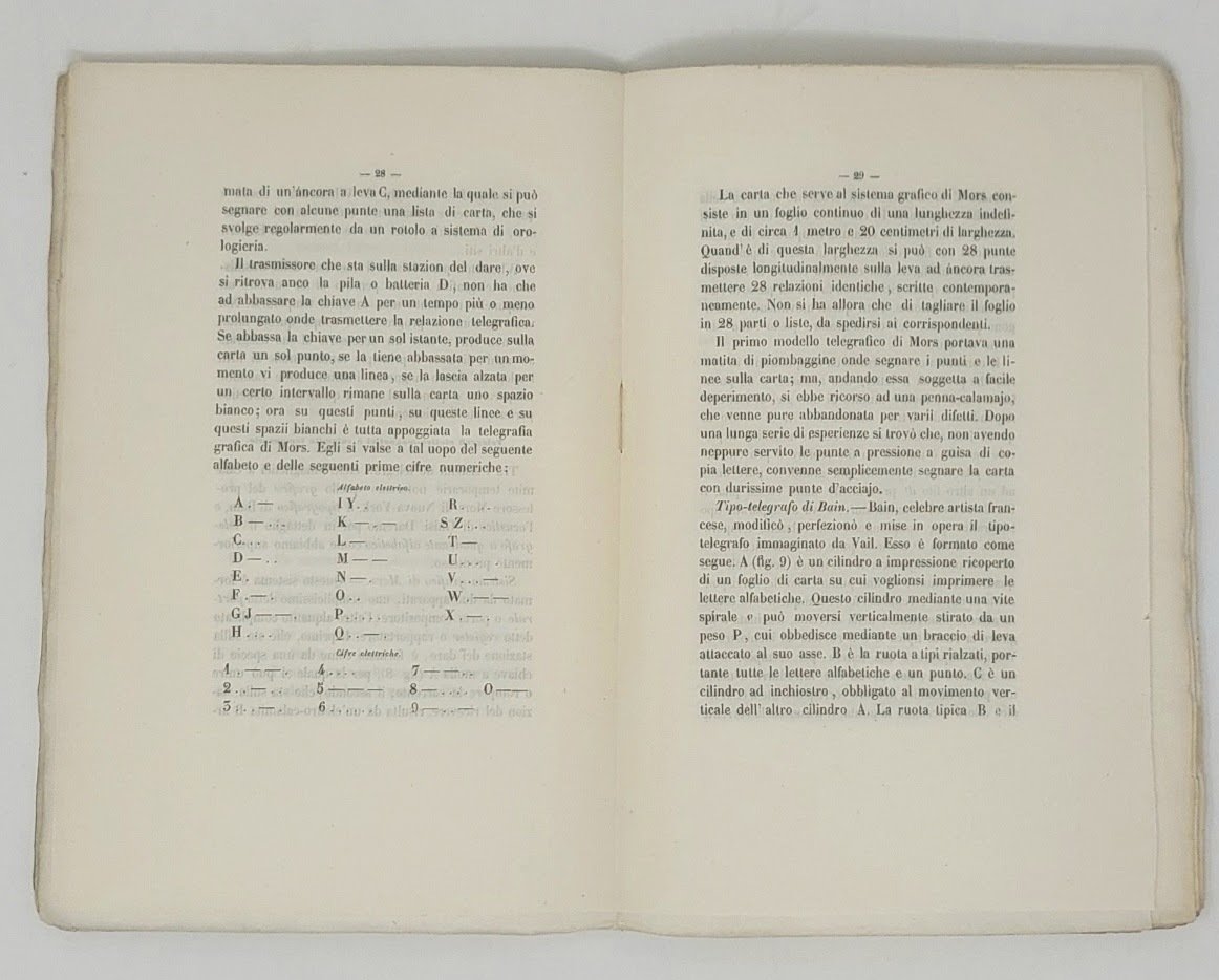 >in-8, pp. 76, 2 tavole ripiegate in fine con 11 modelli di telegrafi, brossura editoriale originale. Monografia sui progressi della tecnologia telegrafica, che descrive tutti i vari modelli sviluppati fino a metà '800, compreso il telegrafo elettro-acustico di invenzione dell'autore. Curiosa la tabella dell'alfabeto Morse, che riporta la prima versione, diversa dall'attuale Codice Morse internazionale che entrò in vigore solo nel 1865. Perfetto esemplare, in cui le 11 figure furono impresse su due tavole ripiegate, invece di una sola.