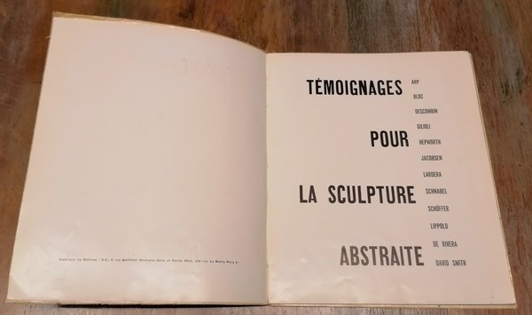 (Arte - Astrattismo - Scultura) Cm 24,5 x 20, brossura editoriale con risvolti, titolo in nero su fondo bianco al piatto anteriore, protezione in acetato, pp 47,(1), con 78 immagini fotografiche in bianco e nero nel testo. Opere di Jean Arp, André Bloc, Maxime Descombin, Emile Gilioli, Barbara Hepworth, Robert Jacobsen, Berto Lardera, Day Schnabel, Nicolas Schoffer, Richard Lippold, José de Rivera, David Smith. Pubblicazione finita di stampare il 24 aprile 1956 presso la Societé Parisienne d'Imprimerie di Parigi. Leggere ossidazioni all'acetato, peraltro esemplare ben conservato.