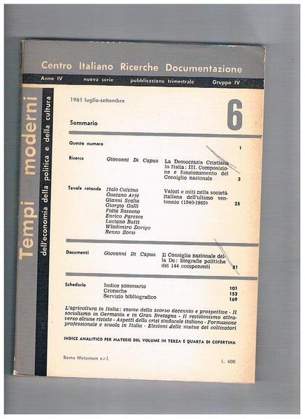 Tempi moderni dell'economia della politica e della cultura. Trimestrale n° lug-set. 1961. La demovrazia cristiana in Italia: III composizione efunzionamento del consiglio nazionale; valori e miti nella società italiana dal 1940 al 1960; il consiglio nazionale DC biografie politiche dei 144 componenti.