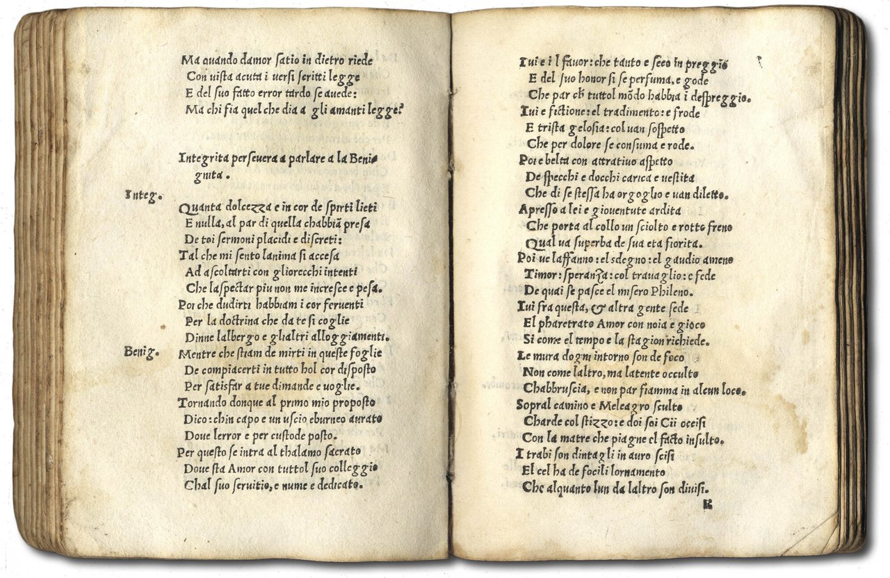 >in-8 (140x100 mm), (124, segn. *2, A-O8, P10). Legatura pergamena rustica coeva, conservata in elegante astuccio mod. m. pelle. Edizione originale, rarissima, di questo componimento teatrale composto verso il 1504 e dedicato a Guglielmo, marchese di Monferrato, presso la cui corte l'A. si rifugiò dopo che il suo castello di Finale fu raso al suolo dai Genovesi. E' un ''dramma allegorico'' in versi, senza la divisione in atti, che tratta un argomento profano nella forma della sacra rappresentazione, ed che include «altri componimenti come la versione in terza rima della ''Tavola di Cebete'' e il riassunto delle ''Metamorfosi'' di Apuleio» (D.B.I). Il piemontese Galeotto Del Carretto (nato nel contado di Acqui poco prima del 1455 e morto nel 1530) è personalità di spicco nell'aristocrazia, nella vita politica e culturale italiana a cavallo dei secoli XV-XVI; fu poeta, scrittore di teatro e storiografo (la sua ''Cronica di Monferrato'' in ottava rima, rimasta inedita per secoli benché fosse conosciuta e citata, ha visto la luce soltanto nel 1898, per cura di Giorcelli, nella ''Rivista di storia della prov. di Alessandria, VII, pp. 8-107"). Di lui il Vallauri, nella sua ''Storia della poesia in Piemonte'', parla a lungo e molto bene, dichiarando che ''un nostro paesano fu quegli che scrisse nel 1502 la prima tragedia italiana, la Sofonisba'' (op. cit. I, p. 71). Bell'esemplare assai puro, a grandi margini, con antica nota di possesso di ''Pietro Bertolotti di Bricherasio'' alla sguardia anter. (Lievi ingialliture qua e là). Manca a Rasi e Bologna (che al n. 119 cita l'ed. 1519). Clubb 350 (solo ediz. 1524). Allacci 756. Sanesi I, 171. Soleinne, suppl. 362 (ed. 1524). BMC 151. ICCU/Edit on-line 16396. DBI XXXVI, 415-419..