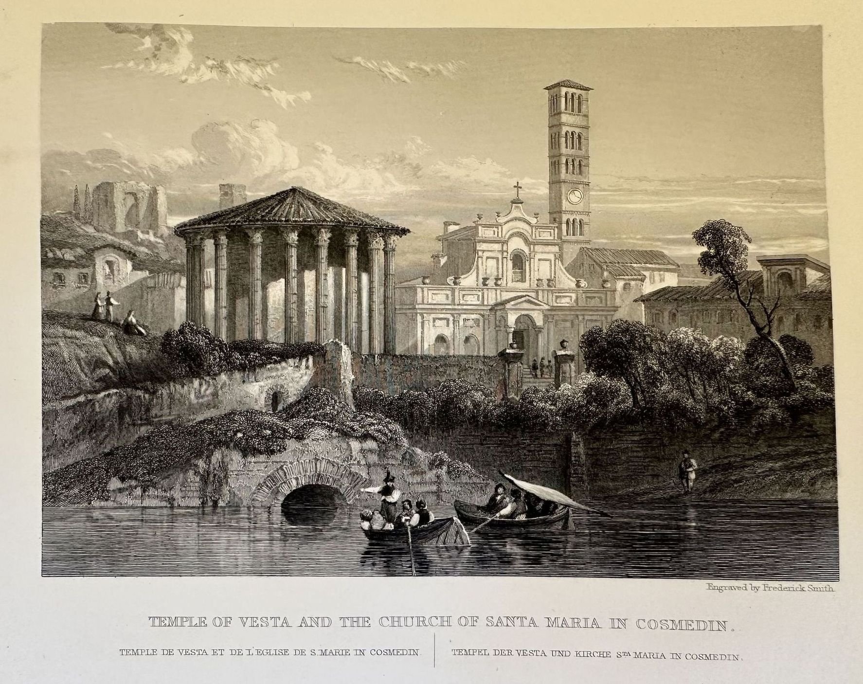 Veduta del Tempio di Vesta e della Chiesa di Santa Maria in Cosmedin. Atlante: Rome and its surrounding scenery Autore: Frederick Smith Data: 1840 circa Tecnica: Litografia Dimensione del foglio: 27,5x20,5 cm Dimensione incisione: 16x11,5 cm Condizioni: Buone. Alcune fioriture.View of the Temple of Vesta and the Chruch of Santa Maria in Cosmedin Atlas: Rome and its surrounding scenery Author: Frederick Smith Date: 1840 circa Technique: Lithography Leaf Dimension:27,5x20,5 cm Engraving Dimension: 16x11,5 cm Conditions: Good conditions. Some foxing.