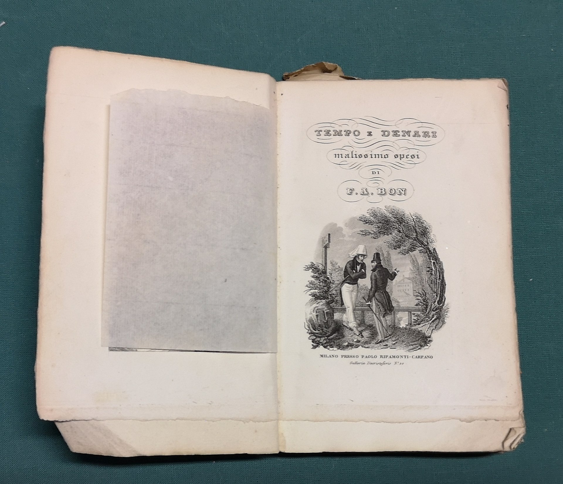 >in-12, pp. 142, (1), broch. edit. Quattro belle incisioni su rame a piena pagina f.t., front. con vignetta figurata. La data di edizione si ricava dal dorso. Prima edizione della commedia di F. A. Bon (Peschiera 1788-Padova 1858), che fu grande sostenitore del ritorno alla semplicità goldoniana contapposta alla commedia romanzesco-lacrimosa. Ottimo esemp. DBIt, XI, pp. 414-416.