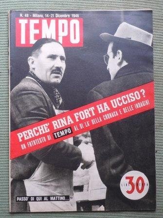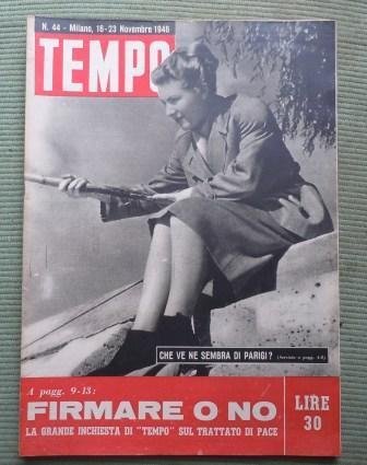 Fondato da Mondadori nel 1939 sospese la pubblicazione per la guerra nel 1943. Ceduto nel 1946 all'editore Aldo Palazzi, riprese le pubblicazioni sotto la direzione di Arturo Tofanelli (già redattore capo durante la direzione di Alberto Mondadori). Il primo numero del dopoguerra uscì il 17 gennaio 1946. NUMERI: 1, 27, 29-50. TOTALE 24 numeri. Spillati, in 4°, cm 35,5. Integri, ottima conservazione. Nel primo numero: PROCESSO E FUCILAZIONE DI CIANO A VERONA, fototesto di un testimone oculare. N. 27: LA CHIROMANTE DI MUSSOLINI (LEDA RAFANELLI). N. 44: FIRMARE O NO! La grande inchiesta di Tempo sul trattato di Pace.