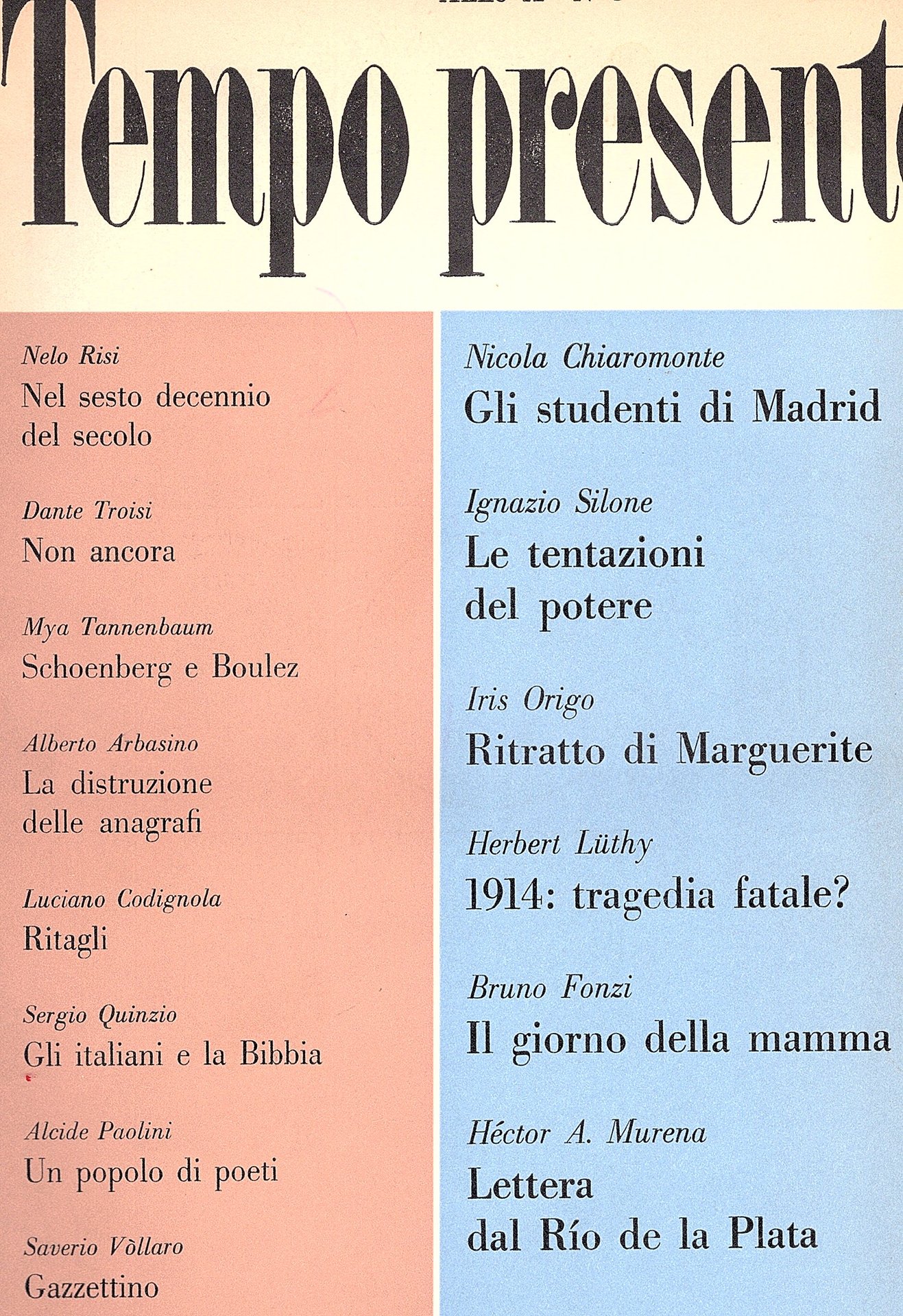 In-8° grande (25x18 cm), brossura editoriale con titoli e sommario al piatto anteriore in quadricromia, paratesti al posteriore. Pp 82. Minimi segni del tempo e d'uso ai piatti e al dorso. Interno fresco. Buon esemplare. Terzo numero della decima annata della rivista internazionale mensile diretta da Ignazio Silone e Nicola Chiaromonte. In questo numero segnaliamo interventi di: D. Troisi, A. arbasino, A. Paolini, Héctor A. Murena, H. Lüthy.