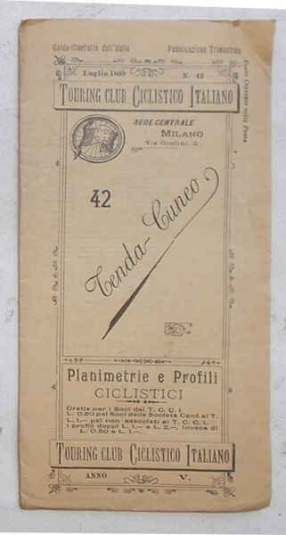 Tavola di 10 facciate di cm. 21 x 8 (perciò lunga cm. 80 circa). VG. ** Le "Planimetrie e profili ciclistici" del Touring Club Ciclistico Italiano sono una collezione di pubblicazioni che ha qualcosa, anzi è più esatto dire molto! di epico: i 57 itinerari, pubblicati in 51 fascicoli tra il 1896 e il 1901, Luigi Vittorio Bertarelli, il fondatore del T.C.I., se li è fatti tutti in bicicletta, appuntando ogni informazione utile su un taccuino. Ogni itinerario è descritto su una lunga tavola, che si svolge orizzontalmente e che è ripiegata in una copertina con titoli, fregi e piccolo stemma del T.C.C.I. La tavola presenta un profilo altimetrico a tre colori e la cartina dell'area, con il tracciato evidenziato in rosso. Il profilo, oltre alle quote, contiene l'indicazione delle distante, della qualità delle strade (polverose, discrete, buone.), delle tappe e altre notizie utili (sorgenti, "splendido panorama", hotel, ristoranti, servizi postali.).