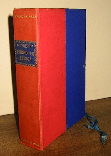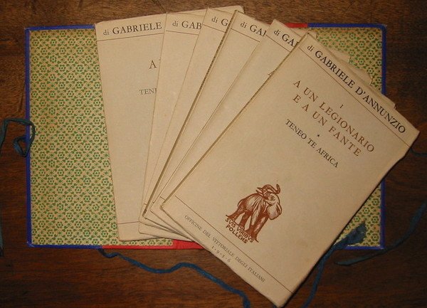 8vo (cm. 18,5), 6 volumetti in facsimile d’autografo ridotto ad un quarto di grandezza: I. A un legionario e a un fante, 2 cc.nn., 37(1) pp., 2 cc.nn. Ristampa dei messaggi ‘Al legionario Agostino Lazzarotto’ e ‘Al Comandante del 315° Battaglione Senior Ennio Giovesi’. II. Ai combattenti italiani oltremare, 2 cc.nn., 75(1) pp., 3 cc.nn. Ristampa del messaggio che precede ‘Il libro ascetico della Giovane Italia’, ristampato nel 1935. III. Non dolet. Arria dixit, 3 cc.nn., 49(1) pp., 2 cc.nn. Ristampa del messaggio a Benito Mussolini del 9 dicembre 1935. IV. Lealtà passa tutto, 1 c.nn., 37(1) pp., 2 cc.nn. Ristampa del capitolo ‘Lealtà passa tutto e con verità fa frutto’ dall’opera ‘Aux bons chevaliers latins de France e d’Italie’. V. Oberdan, 1 c.nn., 23(1) pp., 3 cc.nn. Ristampa dell’omonimo capitolo dell’opera ‘Aux bons chevaliers latins de France e d’Italie’. VI. Adua, 2 cc.nn., 37(1) pp., 3 cc.nn. Ristampa del messaggio a Benito Mussolini datato 1 marzo 1896-1936. Bross. editoriali avana con titoli in nero e marrone. Oltre al titolo del volume è riportato il titolo ciclico ‘Teneo te Africa’ ed, in marrone, l’incisione di un elefante con sottostante la scritta ‘Suis viribus pollens’. I volumetti sono contenuti in una cartella in tela rossa e bleu con titolo oro su tassello al ds. e legacci di chiusura. Ristampa in soli sei volumi della collezione stampata nello stesso anno in 7 volumi (manca l’originario n. III ‘Alla Maestà del Re Vittorio Emanuele III’). Ottimo esemplare. Guabello, 317; Vecchioni, 96b.