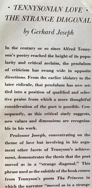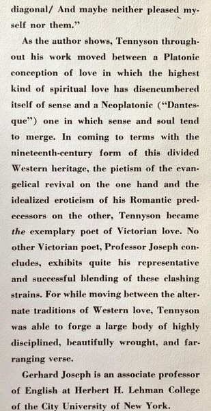 ment, demonstrates the thesis that the poet moved as in a "strange diagonal". This phrase used as the subtitle of the book comes from Tennyson's poem The Princess in which the narrator moved as in a strange diagonal/ And maybe Aust pleased myself nor them.” As the author shows, Tennyson throughout his work moved between a Platonic conception of love in which the highest kind of spiritual love has disencumbered itself of sense and Neoplatonie (Dantesque) one in which sense and soul tend to merge. In coming to terms with the nineteenth-century form of this divided Western heritage, the pietism of the evangelical revival on the one hand and the idealized eroticism of his Romantic predecessors on the other, Tennyson became the exemplary poet of Victorian love. No other Victorian poet, Professor Joseph concludes, exhibits quite his representative and successful blending of these clashing strains. For while moving between the alternate traditions of Western love, Tennyson was able to forge a large body of highly disciplined, beautifully wrought, and farranging verse.
