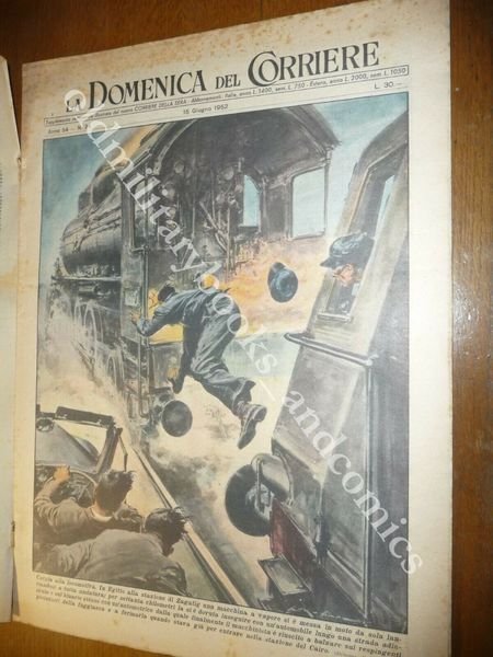 DESCRIZIONE: Domenica del Corriere, Milano, Anno 54 n. 24 (15 GIUGNO 1952). COPERTINA: Una locomotiva, a Zagatic (Cairo), si mette improvvisamente in moto da sola RETRO: La spedizione svizzera capeggiata da Wyss-Dunant è stata costretta a desistere dalla scalata per il sopraggiungere dei monsoni. La Domenica del Corriere è stato un popolare settimanale italiano fondato a Milano nel 1899 e chiuso nel 1989. Apparve per la prima volta nelle edicole l'8 gennaio 1899 come supplemento illustrato del Corriere della Sera. Stampata in grande formato (sul modello del domenicale La Tribuna illustrata), aveva 12 pagine e veniva distribuita gratis agli abbonati del Corriere, oppure si poteva acquistare in edicola per 10 centesimi. La prima e ultima di copertina erano sempre disegnate. Il Corriere si avvaleva di un giovane disegnatore, Achille Beltrame, allora sconosciuto, a cui veniva affidato in ogni numero il compito di rendere con la sua tavola il fatto più interessante della settimana. Dopo la sua morte nel 1945, fu sostituito da Walter Molino che, come il suo predecessore, firmò memorabili copertine. A differenza dei settimanali dell'epoca, la Domenica del Corriere diede ampio spazio alle fotografie e ai disegni, e questo fu uno dei motivi del suo successo. CONDIZIONI: Buone rivista con azzurrina. PESO / WEIGHT: 200 gr. without package