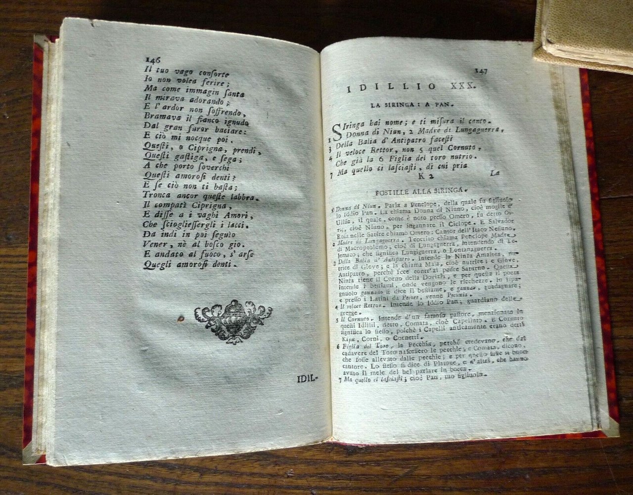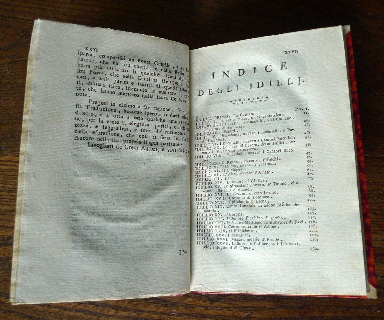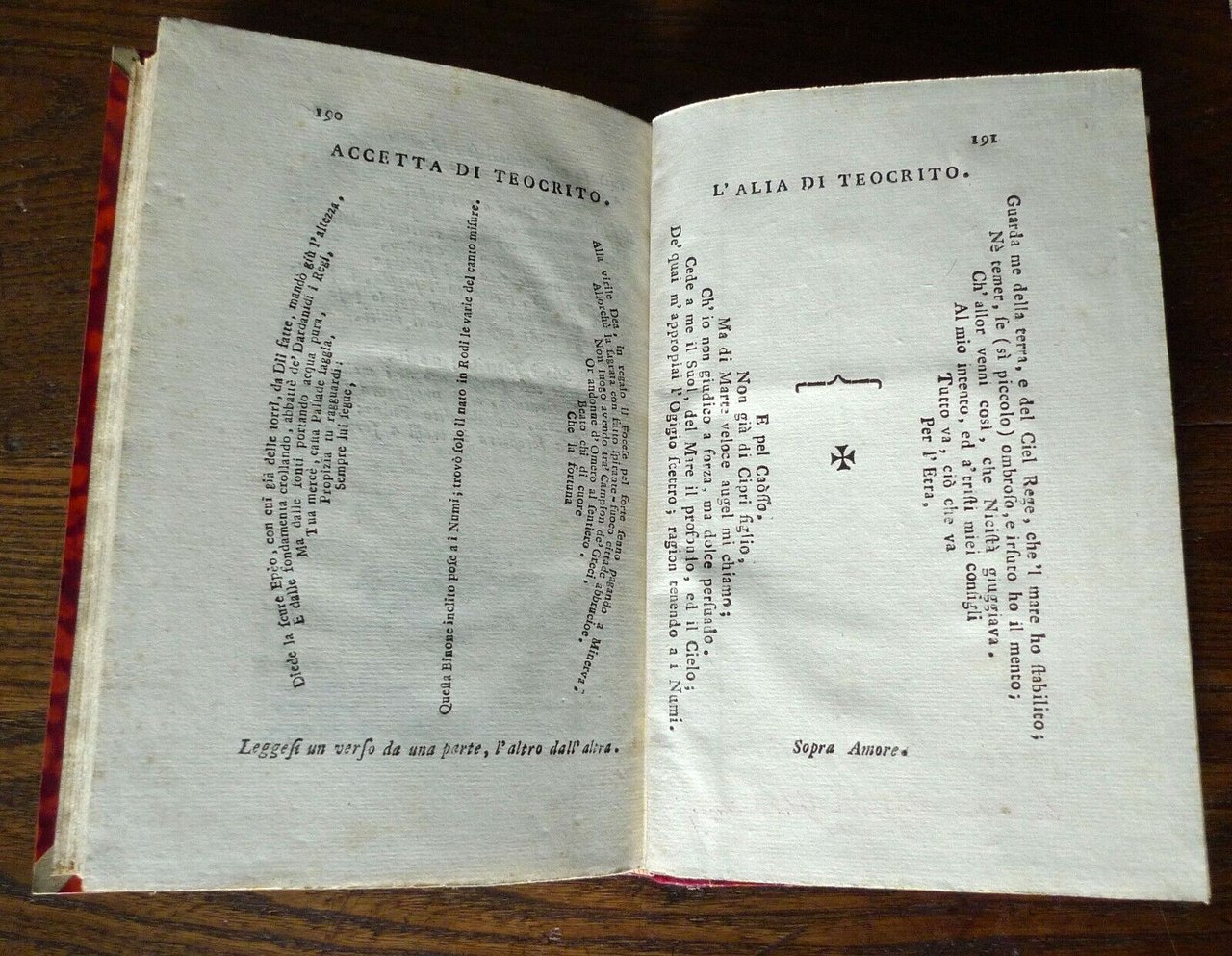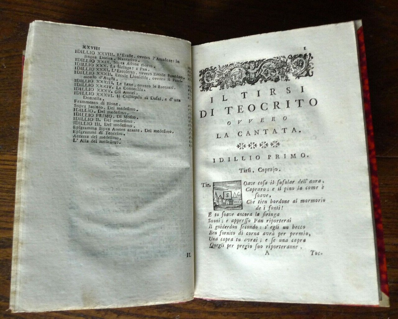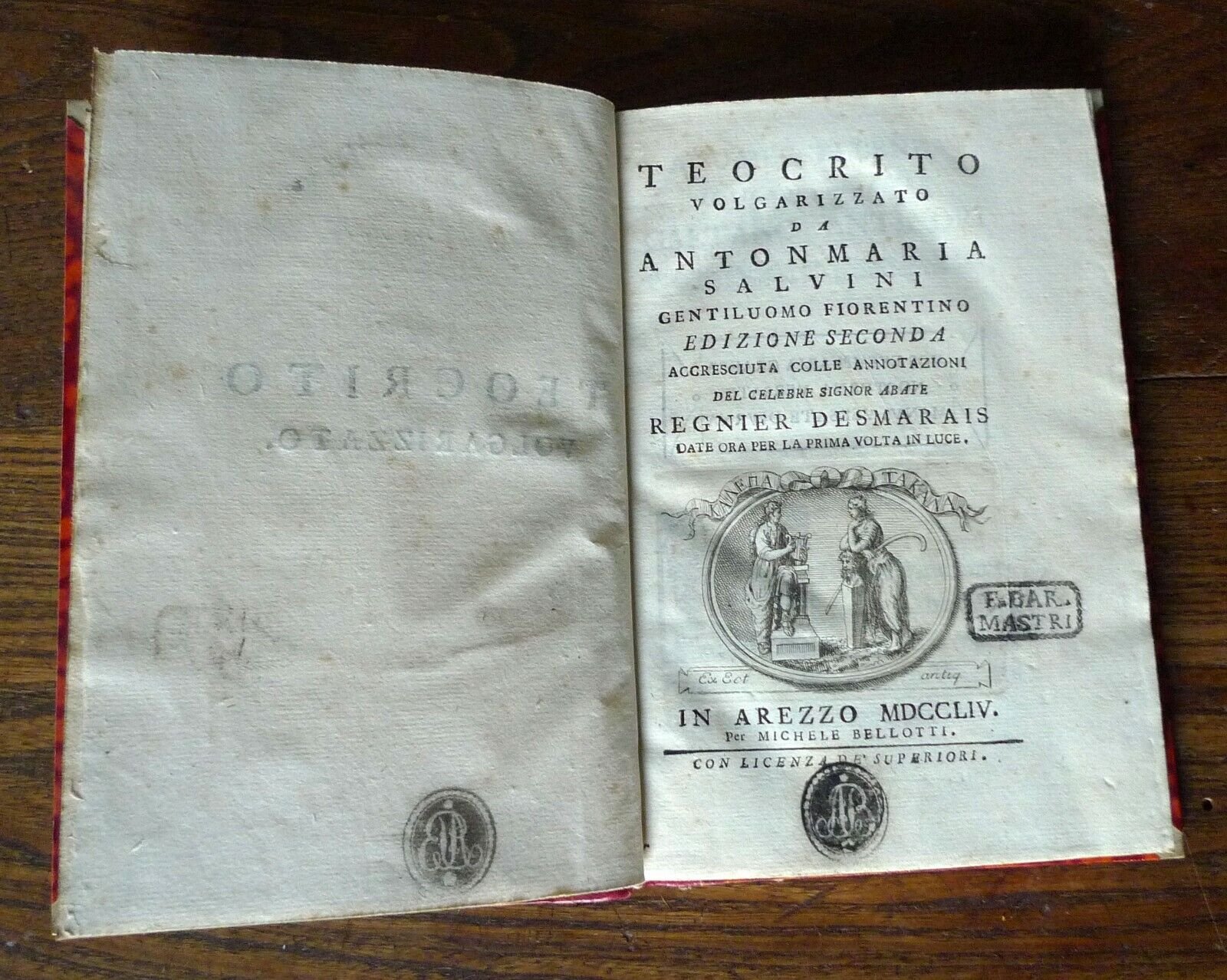 TEOCRITO VOLGARIZZATO DA ANTON MARIA SALVINIGENTILUOMO FIORENTINOEdizione seconda accresciuta colle annotazioni del CELEBRE SIGNOR abate Regnier Desmarais, date ora per la prima volta in luce.IN AREZZO, MDCCLIV (1754), PER MICHELE BELLOTTI,copertina rigida, rilegatura in mezza pelle,18x12,5 cm., pp.XXVIII-191,prefazione di Anton Francesco Gori,vignetta al frontespizio,peso: g.260