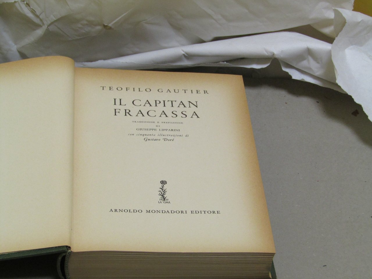 Teofilo Guatier. Teofilo Guatier. Il capitan Fracassa.. Verona, Arnoldo Mondadori editore 1958 italiano, in ottavo pp.560 Il capolavoro di Gautier illustrato con i disegni di Gustavo Dorè. La storia del barone di Sigognac che, mosso da spirito d'avventura e dall'amore per una fanciulla, si arruola in una compagnia di guitti.