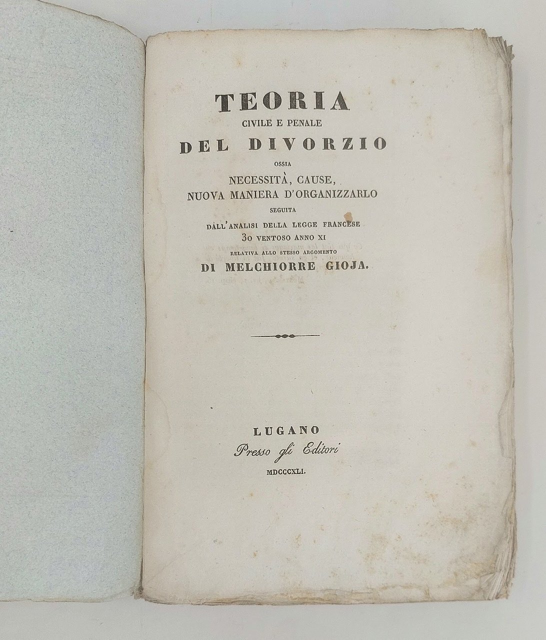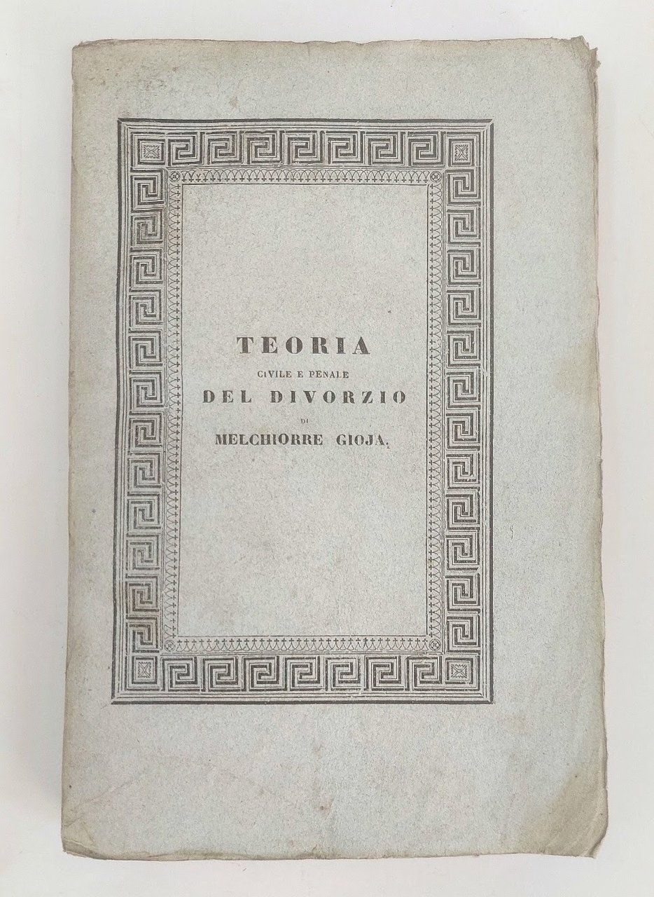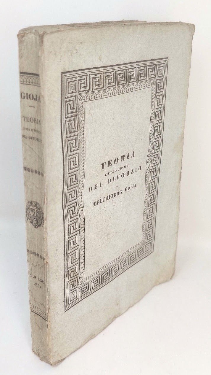 >in-8, pp. 284, broch. edit. L'opera è così suddivisa: necessità del divorzio, cause di divorzi ed esposizione del titolo VI del codice civile della Repubblica francese, riguardante il divorzio. Bell'esemplare intonso di questo interessante testo giuridico la cui prima edizione venne stampata nel 1803. [GORLA. 91]