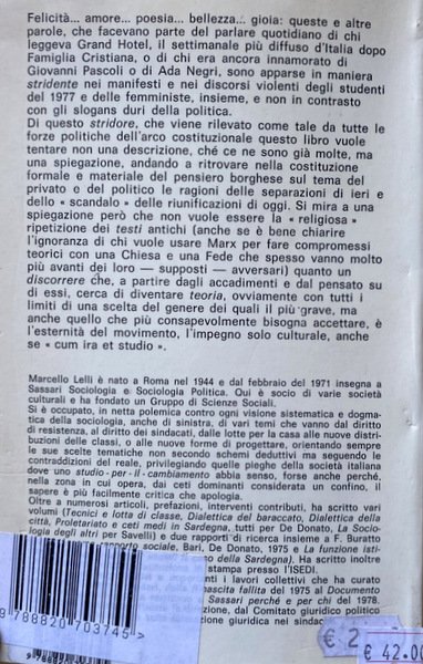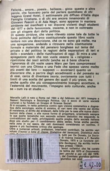 Felicità. amore. poesia. bellezza. gioia: queste e altre parole, che facevano parte del parlare quotidiano di chi leggeva Grand Hotel, il settimanale più diffuso d'Italia dopo Famiglia Cristiana, o di chi era ancora innamorato di Giovanni Pascoli o di Ada Negri, sono apparse in maniera stridente nei manifesti e nei discorsi violenti degli studenti del 1977 e delle femministe, insieme, e non in contrasto con gli slogans duri della politica. Di questo stridore, che viene rilevato come tale da tutte le forze politiche dell'arco costituzionale questo libro vuole tentare non una descrizione, ché ce ne sono già molte, ma una spiegazione, andando a ritrovare nella costituzione formale e materiale del pensiero borghese sul tema del privato e del politico le ragioni delle separazioni di ieri e dello scandalo» delle riunificazioni di oggi. Si mira a una spiegazione però che non vuole essere la «religiosa ripetizione dei testi antichi (anche se è bene chiarire l'ignoranza di chi vuole usare Marx per fare compromessi teorici con una Chiesa e una Fede che spesso vanno molto più avanti dei loro supposti avversari) quanto un discorrere che, a partire dagli accadimenti e dal pensato su di essi, cerca di diventare teoria, ovviamente con tutti i limiti di una scelta del genere dei quali il più grave, ma anche quello che più consapevolmente bisogna accettare, è l'esternità del movimento, l'impegno solo culturale, anche se «cum ira et studio».