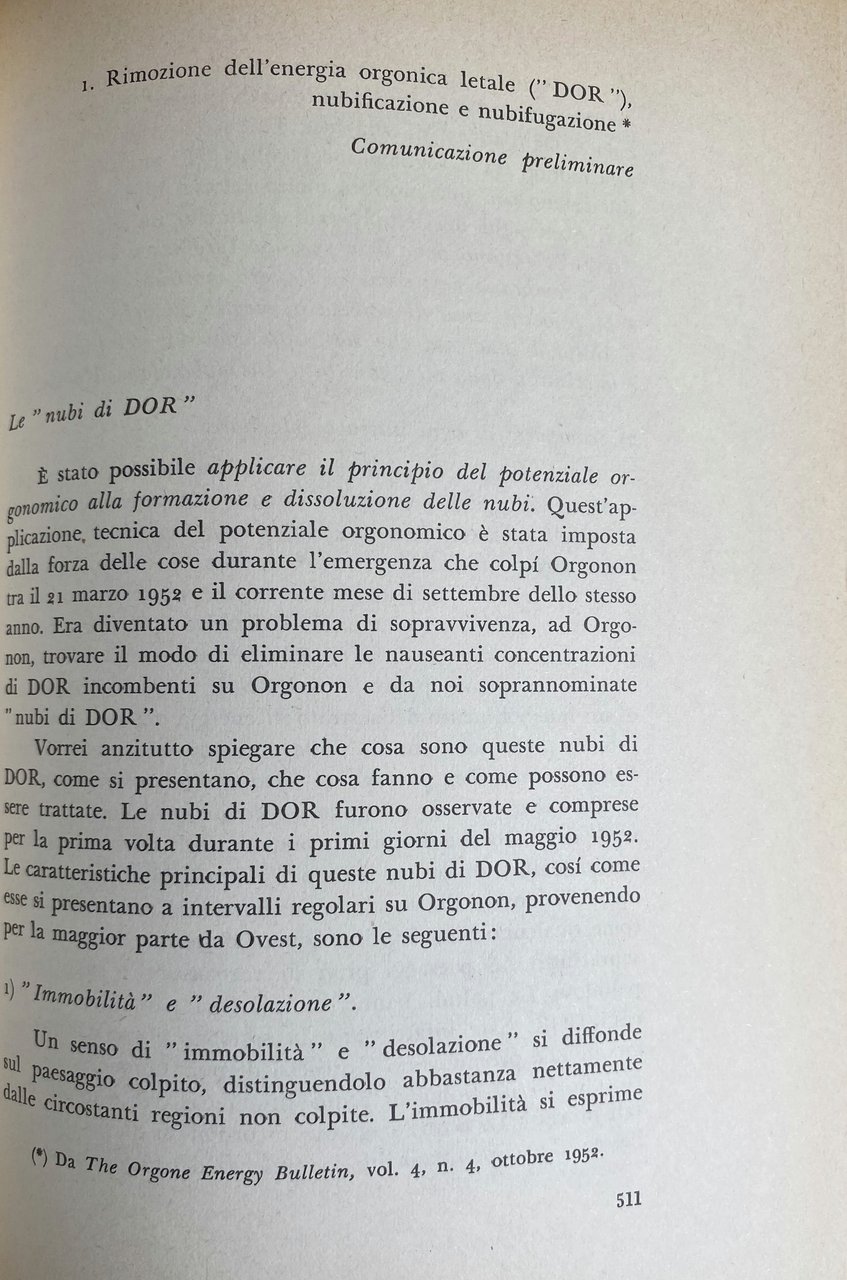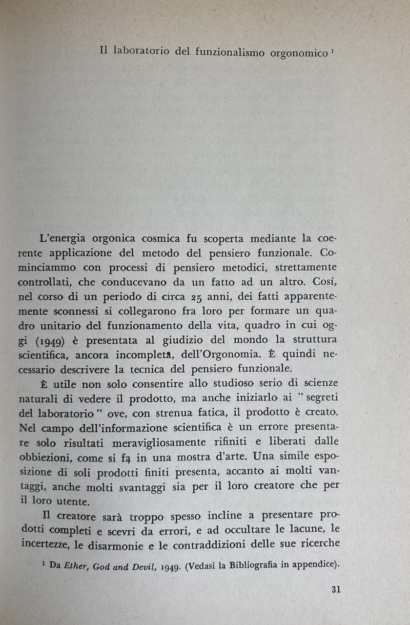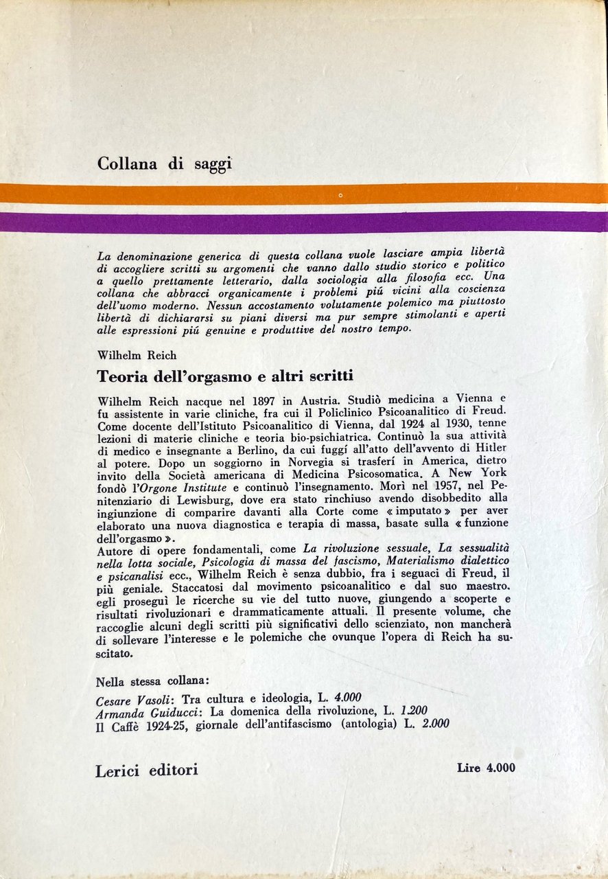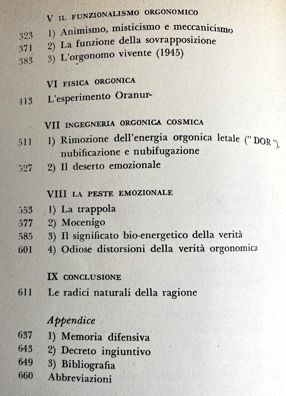 Soggetti: Orgonomia Anorgonia Funzione Orgasmo Infant Trust Fund Psicosomatica Psicologia Scoperte scientifiche Invenzioni Teoria Tecnica Analisi Caratterale Blocco respiratorio Corazza muscolare Auto-regolazione sessuo-economica Impulsi primari Secondari Perversi Antisociali Irrazionalismo Repressione Dittature Riflesso orgastico Natura bioelettrica Sessualità Angoscia Bioni Vescicole Energia orgonica Cellula cancerosa Bio-energia SAPA Accumulatore Misuratore Campo Terapia sperimentale Biogenesi Funzionalismo orgonomico Peste Emozionale Equilibrio bioenergetico Equazioni orgonometriche Sovrapposizione Sanità psichica Glossario Cancro Cellule cancerose Sviluppo Laboratorio Penetrazione Sfera vegetativa Linguaggio espressivo Sostanza vivente Orgone Biopatia ritrattiva carcinomatosa Animismo Misticismo Meccanicismo Fisica Esperimento Oranur Ingegneria Cosmica Rimozione letale DOR Nubificazione Nubifugazione Deserto Trappola Mocenigo Significato Verità Ragione Memoria difensiva Decreto ingiuntivo Bibliografia Riferimento Libri rari Vintage fuori catalogo Collezionismo Rivoluzione sessuale Teorie Medicina Sigmund Freud Psiche Riproduzione Disturbi psichici Sintomi Libido Nevrosi Corazze caratteriali Fisiologia Muscolari Potere Educazione familiare Morale collettiva Corpo Potenza orgasmica Sociologia Psicoanalisi Critica marxista Biologia Partito comunista Ebrei Stati Uniti Pratica clinica Analisti Autoritarismo Bambini Base bio-elettrica Carattere Caratteriale Carica Complesso di Edipo Comportamento Concezione Conflitti Contrazione Eccitazione Der Stürmer Donna Fantasie Freno Genitali Hitler Impulso Inconscio Infantile Inibizione Malati Malattie veneree Masochismo Masturbazione Meccanismi Muscolatura Organi Patologia Paura Pazienti Peer Gynt Piacere Psichiatria Pulsione Morte Rapporti sessuali Sadismo Schizofrenia Scienza Economia Sessuologia Somatico Tensione Trattamento Trobriand Zona erogena Uomini Donne Differenze Genere Consultazione Antologie Raccolte di scritti Saggi Novecento Herbert Marcuse Norman Mailer Gestalt Fascismo Massa Partner Matrimonio Relazioni Società autoritaria Igiene Stasi Anorgasmia Impotenza Democrazia Lavoro Funktion orgasmus Triebhafte Charakter Materialismo dialettico Kulturkampft Lenin Libertarismo Lindsey Lotta Marxismo Ormoni Ideologia Patriarcato Ether God Devil Cosmic Superimposition Murder of Christ Giordano Bruno Uccisione Assassinio Cristo Atti Verbali Processo FDA Difesa Lettere Orgonomy Function Orgasm Psychosomatic Psychology Scientific discoveries Inventions Theory Technique Character analysis Respiratory block Muscular armor Sexual-economic self-regulation Primary impulses Secondary Perverse Antisocial Irrationalism Repression Dictatorships Orgastic reflex Bioelectric nature Sexuality Anguish Bions Vesicles Energy Cancer cell Bio-energy Accumulator Meter Field Experimental therapy Biogenesis Orgonomic functionalism Plague Emotional Bioenergetic balance Orgonometric equations Superposition Health Glossary Development Laboratory Penetration Vegetative sphere Expressive language Living substance Carcinomatous retractive biopathy Animism Mysticism Mechanism Physics Experiment Engineering Lethal removal Nubification Desert Trap Meaning Truth Reason Defensive memory Injunctive decree Bibliography Reference Rare books out of print Collectibles Sexual revolution Theories Medicine Psyche Reproduction Disorders Symptoms Neurosis Physiology Power Family education Collective morality Body Orgasmic Sociology Psychoanalysis Marxist criticism Biology Communist party Jews United States Clinical practice Analysts Authoritarianism Children Bio-electrical basis Charge Oedipus complex Behavior Conception Conflicts Contraction Excitation Woman Fantasies Brake Genitals Impulse Unconscious Inhibition Venereal diseases Masochism Masturbation Mechanisms Musculature Organs Pathology Fear Patients Pleasure Psychiatry Drive Death Sadism Schizophrenia Science Economy Sexology Somatic Tension Treatment Erogenous zone Men Women Differences Gender Consultation Anthologies Collections of writings Essays Twentieth century Fascism Marriage Relationships Authoritarian society Hygiene Stasis Impotence Democracy Work Materialism dialectical Libertarianism Fight Hormones Ideology Patriarchy Killing Assassination Verbal Acts Trial Defense Letters
