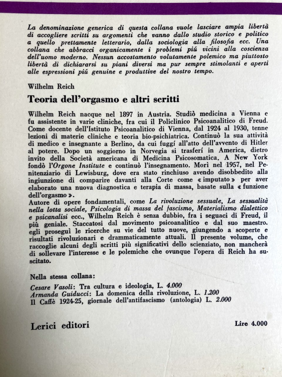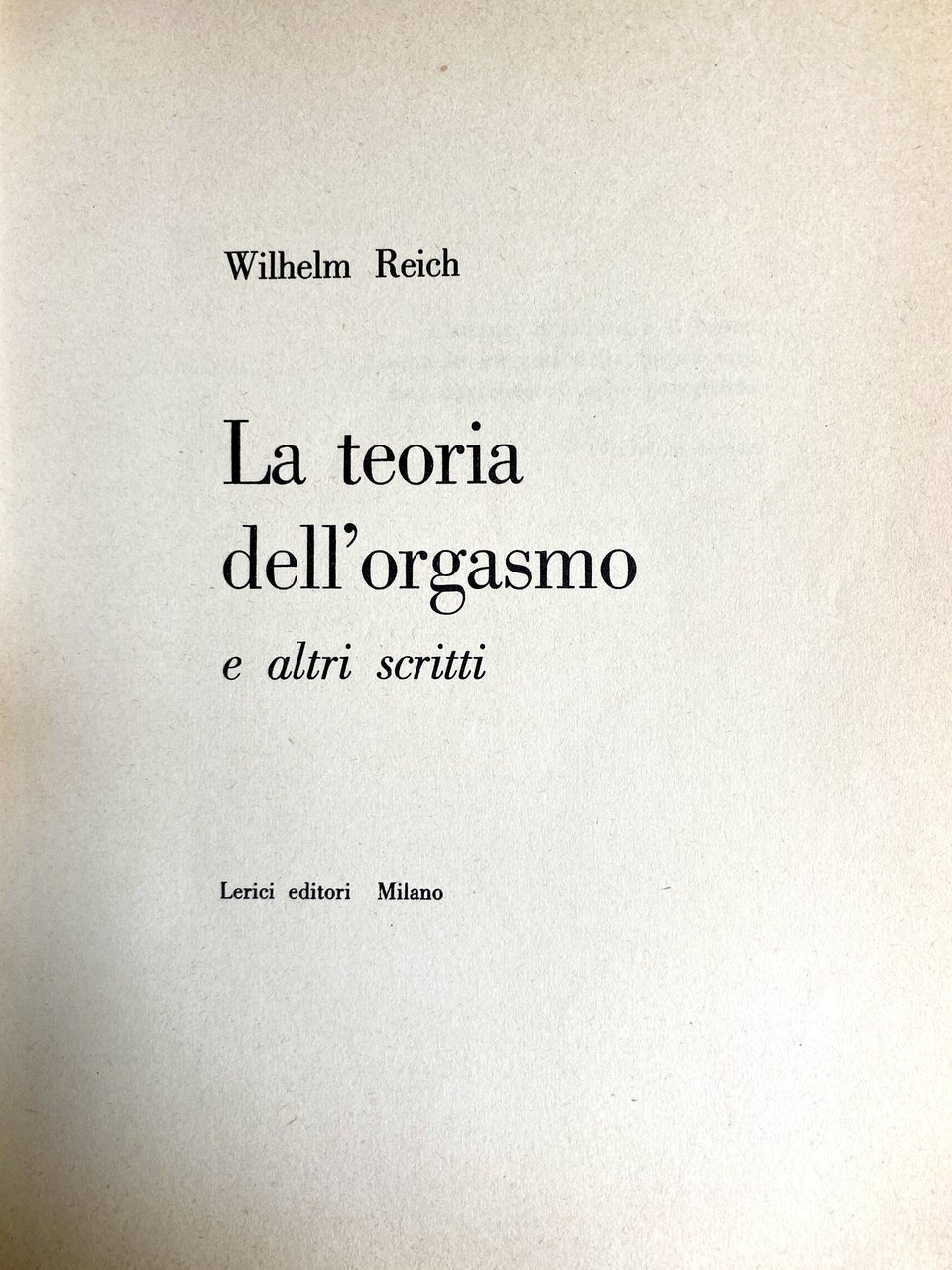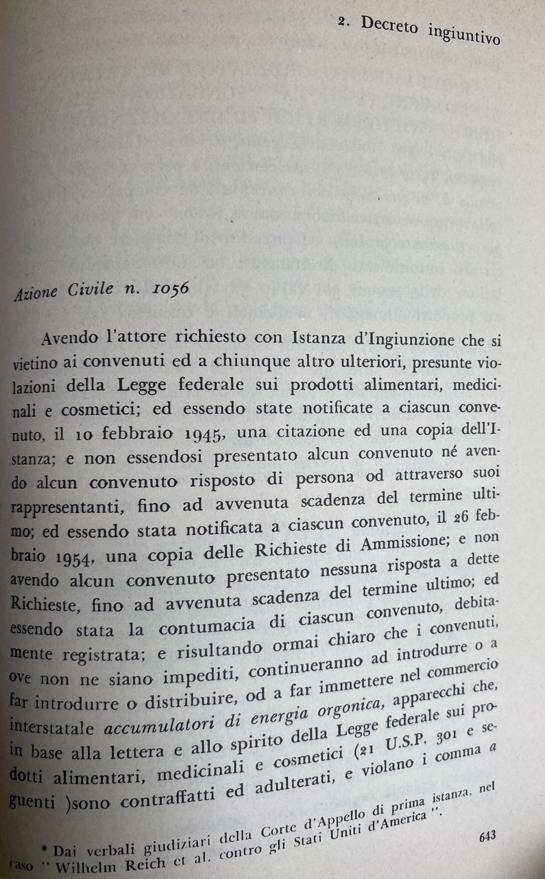 Soggetti: Orgonomia Anorgonia Funzione Orgasmo Infant Trust Fund Psicosomatica Psicologia Scoperte scientifiche Invenzioni Teoria Tecnica Analisi Caratterale Blocco respiratorio Corazza muscolare Auto-regolazione sessuo-economica Impulsi primari Secondari Perversi Antisociali Irrazionalismo Repressione Dittature Riflesso orgastico Natura bioelettrica Sessualità Angoscia Bioni Vescicole Energia orgonica Cellula cancerosa Bio-energia SAPA Accumulatore Misuratore Campo Terapia sperimentale Biogenesi Funzionalismo orgonomico Peste Emozionale Equilibrio bioenergetico Equazioni orgonometriche Sovrapposizione Sanità psichica Glossario Cancro Cellule cancerose Sviluppo Laboratorio Penetrazione Sfera vegetativa Linguaggio espressivo Sostanza vivente Orgone Biopatia ritrattiva carcinomatosa Animismo Misticismo Meccanicismo Fisica Esperimento Oranur Ingegneria Cosmica Rimozione letale DOR Nubificazione Nubifugazione Deserto Trappola Mocenigo Significato Verità Ragione Memoria difensiva Decreto ingiuntivo Bibliografia Riferimento Libri rari Vintage fuori catalogo Collezionismo Rivoluzione sessuale Teorie Medicina Sigmund Freud Psiche Riproduzione Disturbi psichici Sintomi Libido Nevrosi Corazze caratteriali Fisiologia Muscolari Potere Educazione familiare Morale collettiva Corpo Potenza orgasmica Sociologia Psicoanalisi Critica marxista Biologia Partito comunista Ebrei Stati Uniti Pratica clinica Analisti Autoritarismo Bambini Base bio-elettrica Carattere Caratteriale Carica Complesso di Edipo Comportamento Concezione Conflitti Contrazione Eccitazione Der Stürmer Donna Fantasie Freno Genitali Hitler Impulso Inconscio Infantile Inibizione Malati Malattie veneree Masochismo Masturbazione Meccanismi Muscolatura Organi Patologia Paura Pazienti Peer Gynt Piacere Psichiatria Pulsione Morte Rapporti sessuali Sadismo Schizofrenia Scienza Economia Sessuologia Somatico Tensione Trattamento Trobriand Zona erogena Uomini Donne Differenze Genere Consultazione Antologie Raccolte di scritti Saggi Novecento Herbert Marcuse Norman Mailer Gestalt Fascismo Massa Partner Matrimonio Relazioni Società autoritaria Igiene Stasi Anorgasmia Impotenza Democrazia Lavoro Funktion orgasmus Triebhafte Charakter Materialismo dialettico Kulturkampft Lenin Libertarismo Lindsey Lotta Marxismo Ormoni Ideologia Patriarcato Ether God Devil Cosmic Superimposition Murder of Christ Giordano Bruno Uccisione Assassinio Cristo Atti Verbali Processo FDA Difesa Lettere Orgonomy Function Orgasm Psychosomatic Psychology Scientific discoveries Inventions Theory Technique Character analysis Respiratory block Muscular armor Sexual-economic self-regulation Primary impulses Secondary Perverse Antisocial Irrationalism Repression Dictatorships Orgastic reflex Bioelectric nature Sexuality Anguish Bions Vesicles Energy Cancer cell Bio-energy Accumulator Meter Field Experimental therapy Biogenesis Orgonomic functionalism Plague Emotional Bioenergetic balance Orgonometric equations Superposition Health Glossary Development Laboratory Penetration Vegetative sphere Expressive language Living substance Carcinomatous retractive biopathy Animism Mysticism Mechanism Physics Experiment Engineering Lethal removal Nubification Desert Trap Meaning Truth Reason Defensive memory Injunctive decree Bibliography Reference Rare books out of print Collectibles Sexual revolution Theories Medicine Psyche Reproduction Disorders Symptoms Neurosis Physiology Power Family education Collective morality Body Orgasmic Sociology Psychoanalysis Marxist criticism Biology Communist party Jews United States Clinical practice Analysts Authoritarianism Children Bio-electrical basis Charge Oedipus complex Behavior Conception Conflicts Contraction Excitation Woman Fantasies Brake Genitals Impulse Unconscious Inhibition Venereal diseases Masochism Masturbation Mechanisms Musculature Organs Pathology Fear Patients Pleasure Psychiatry Drive Death Sadism Schizophrenia Science Economy Sexology Somatic Tension Treatment Erogenous zone Men Women Differences Gender Consultation Anthologies Collections of writings Essays Twentieth century Fascism Marriage Relationships Authoritarian society Hygiene Stasis Impotence Democracy Work Materialism dialectical Libertarianism Fight Hormones Ideology Patriarchy Killing Assassination Verbal Acts Trial Defense Letters